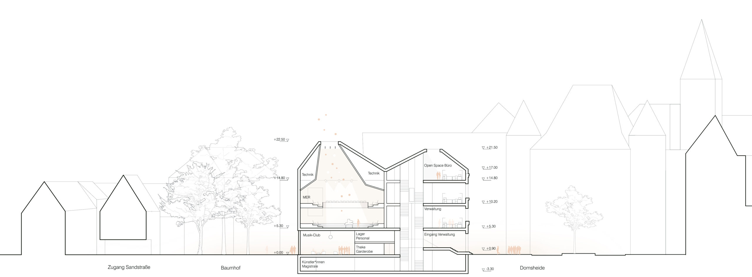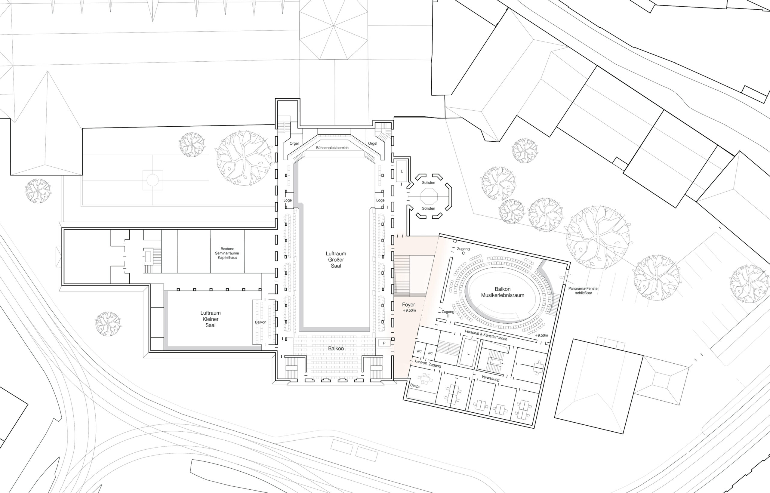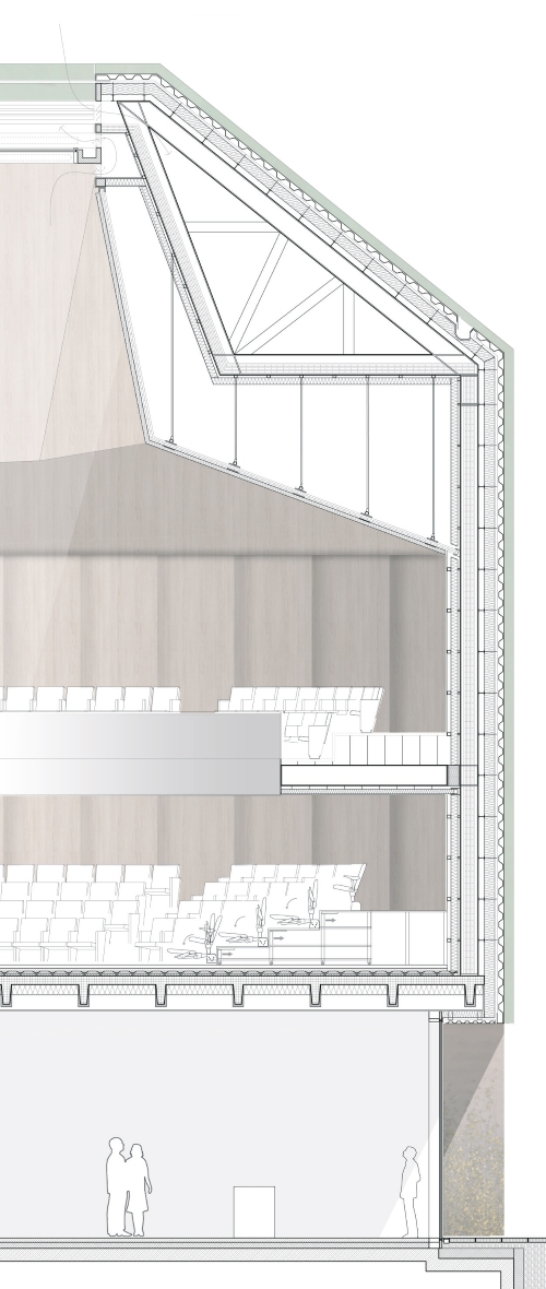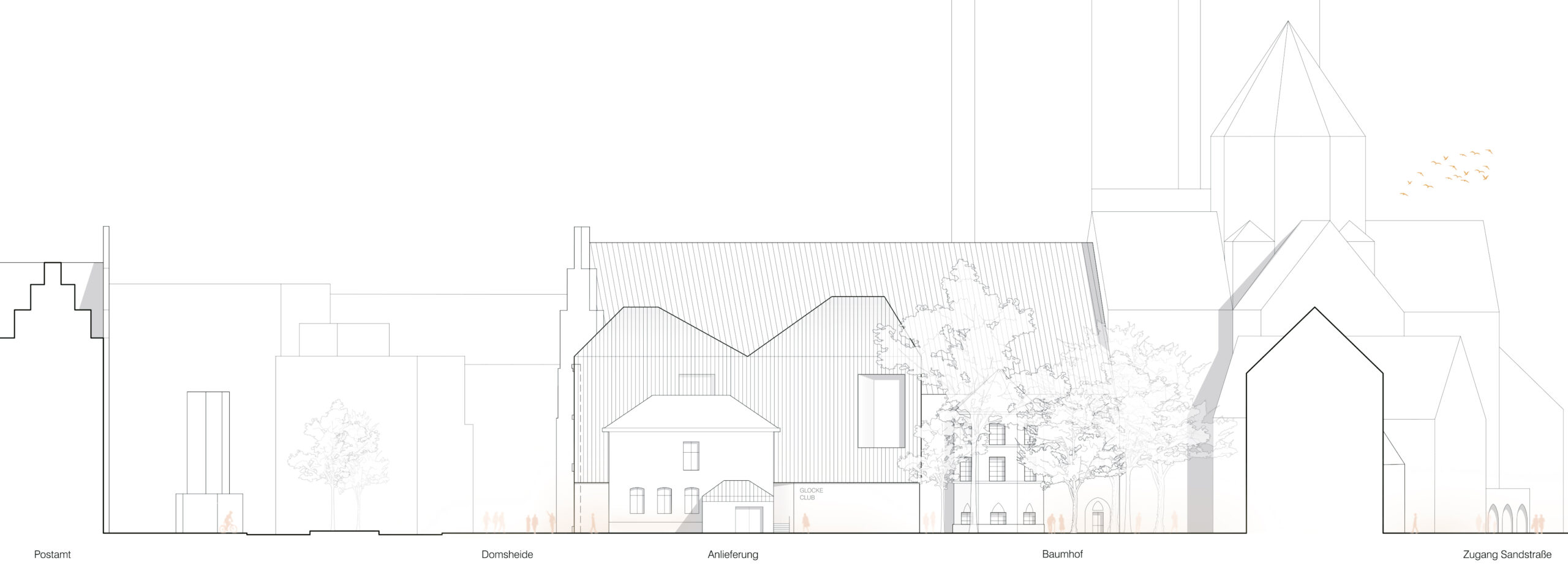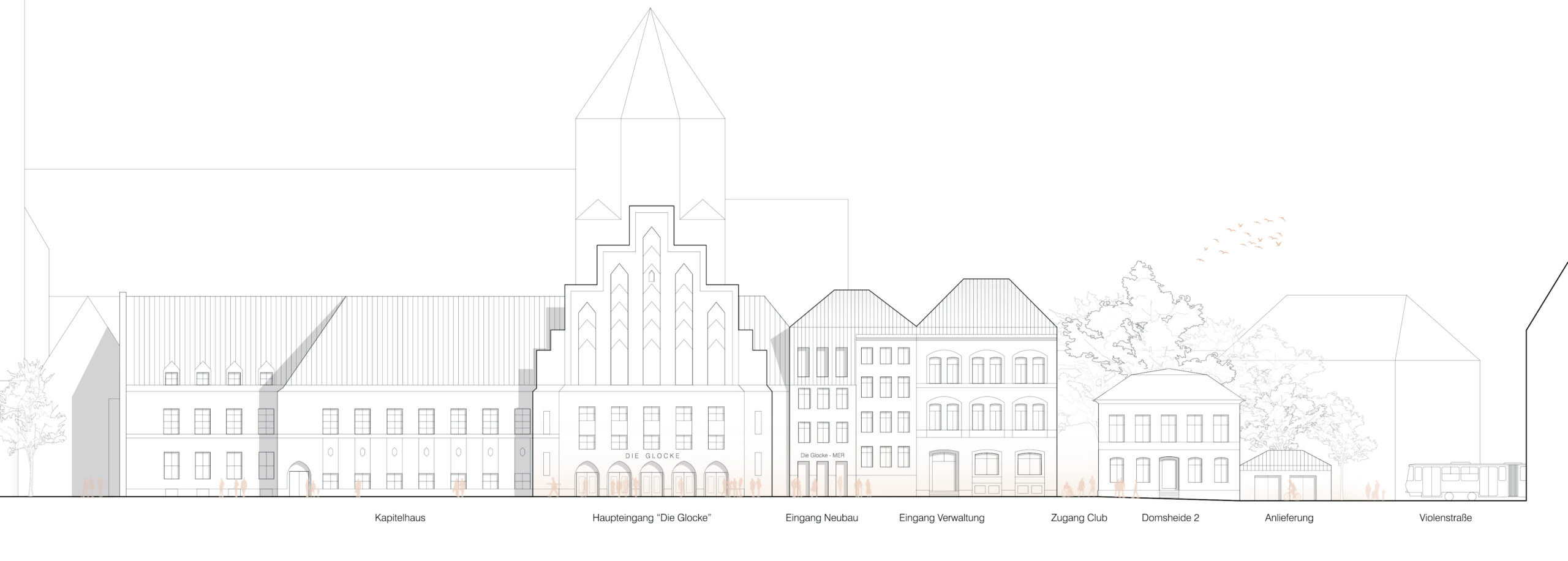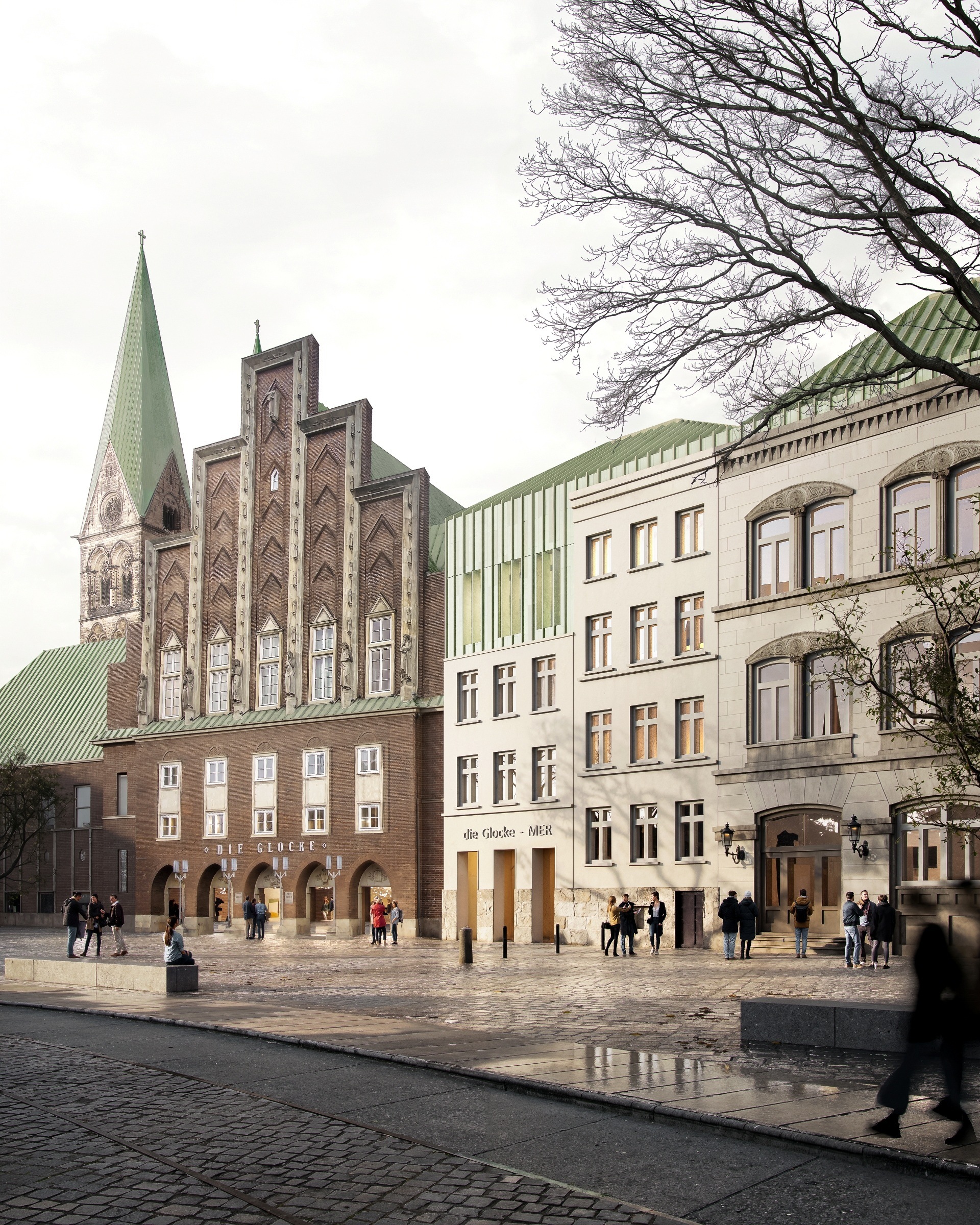 The proposal expands Bremen’s renowned concert hall Die Glocke by carefully embedding a new volume into the historic context of Domsheide. A clear geometric form connects to the existing building through a transparent glass joint, preserving and integrating listed façades and reinforcing the continuity of the urban block. The new pitched copper roofs echo Bremen’s characteristic roofscape, anchoring the extension within the city’s silhouette while establishing a distinct contemporary identity. Strategic façade openings create visual dialogue with the surrounding public spaces and reveal the musical life inside. The project centers on a new “Musikerlebnisraum” with an elliptical seating arrangement around a predominantly central stage, fostering intimacy between performers and audience. A light-filled foyer atrium links the historic halls and the new space, allowing independent and combined operation. The result is a seamless spatial continuum that strengthens Die Glocke’s cultural presence while enhancing its urban integration and architectural clarity.