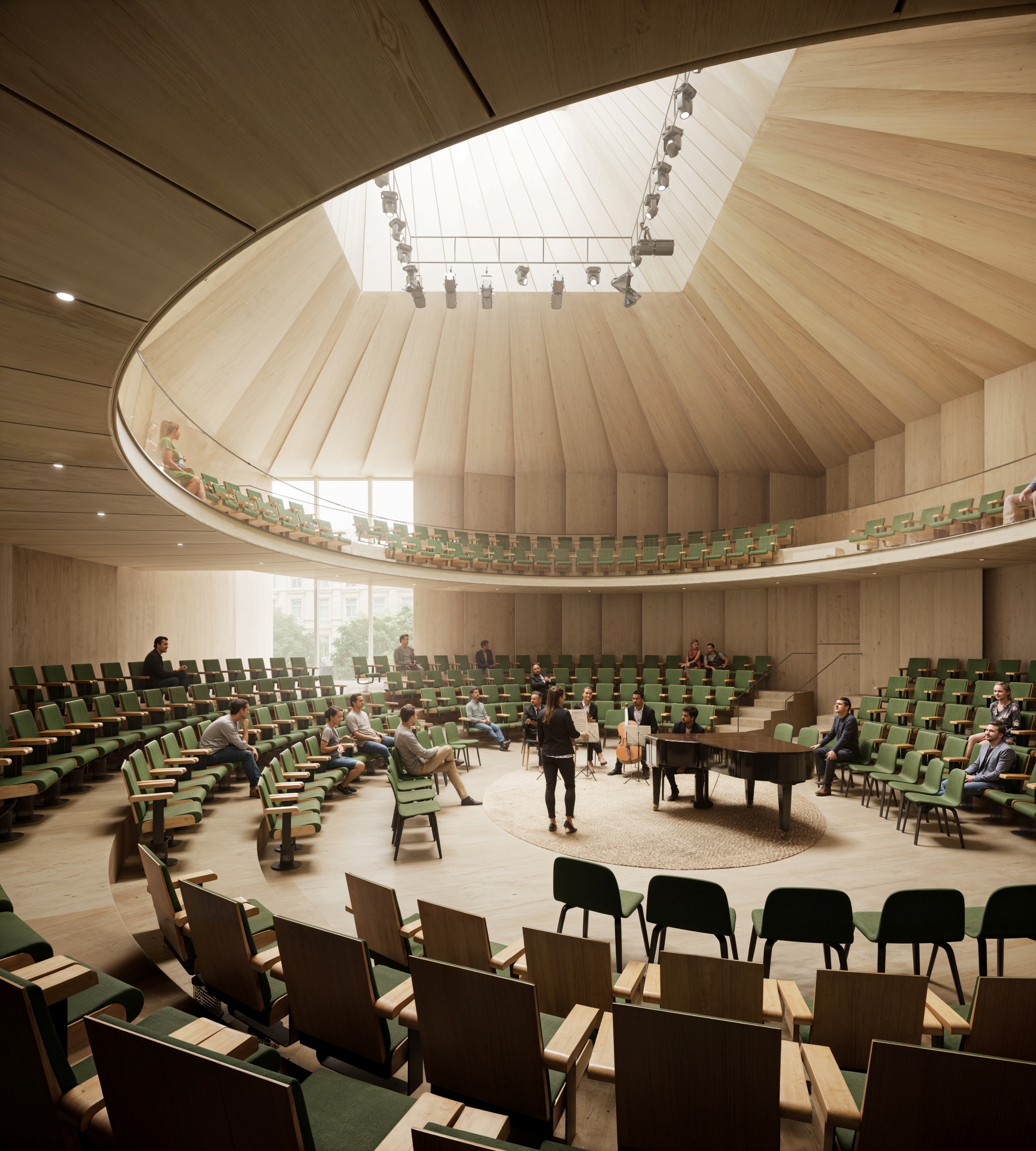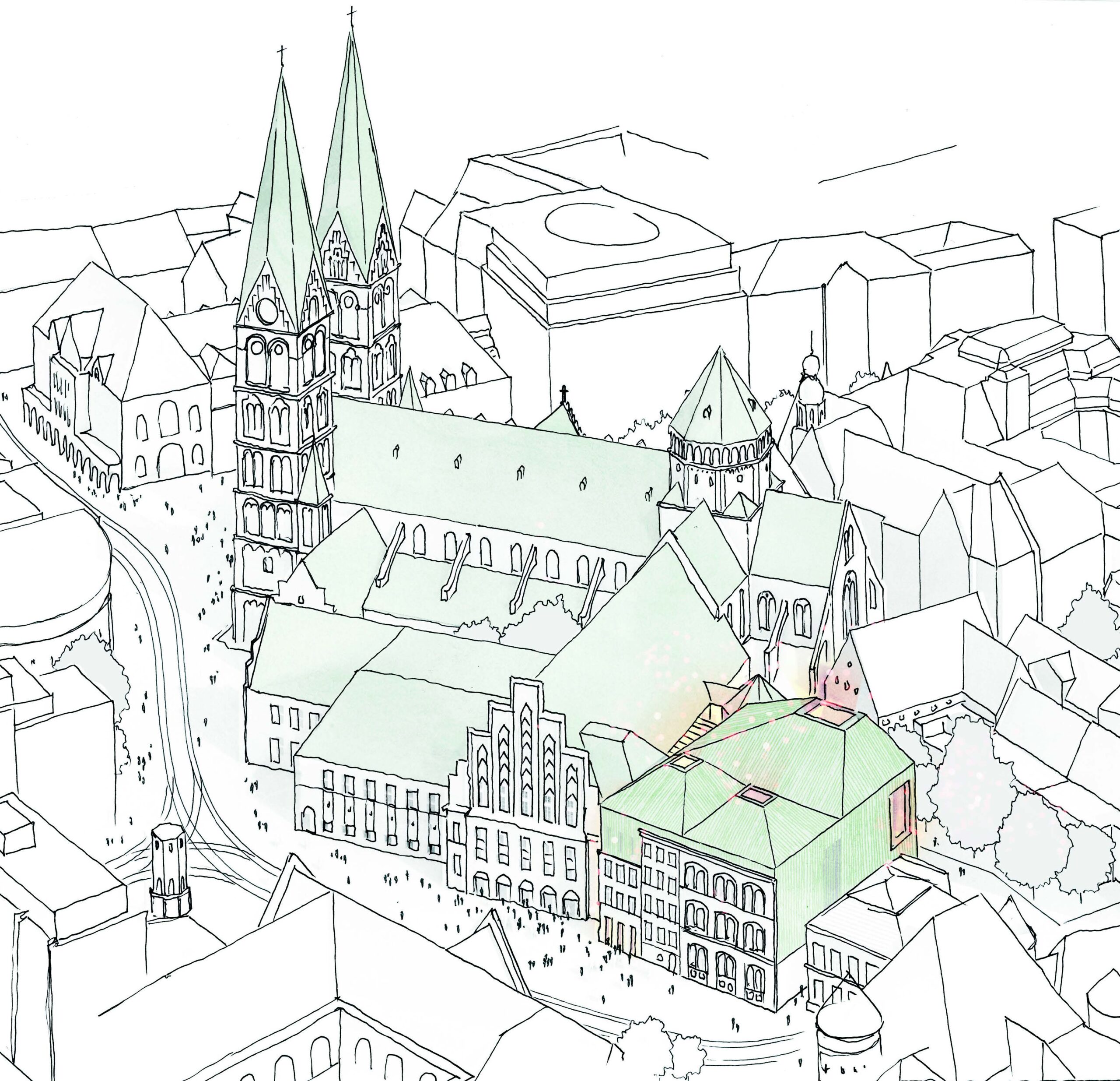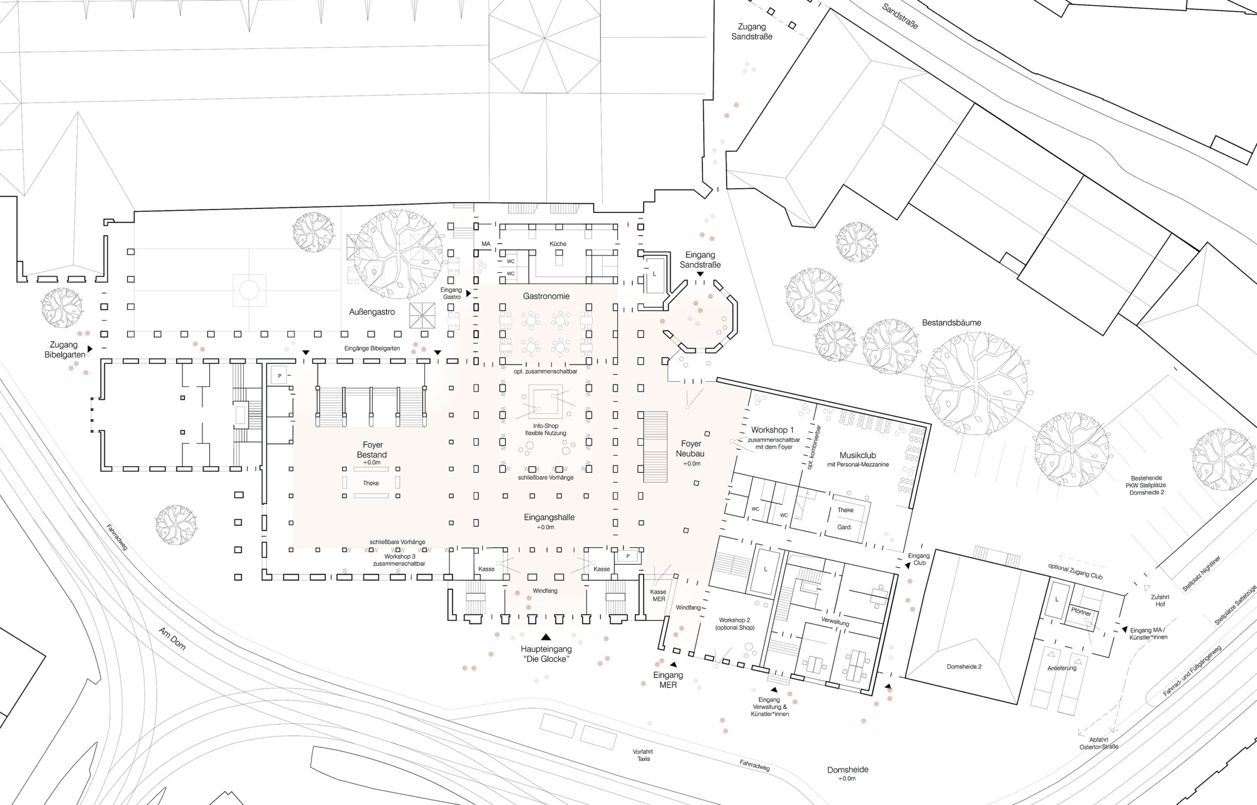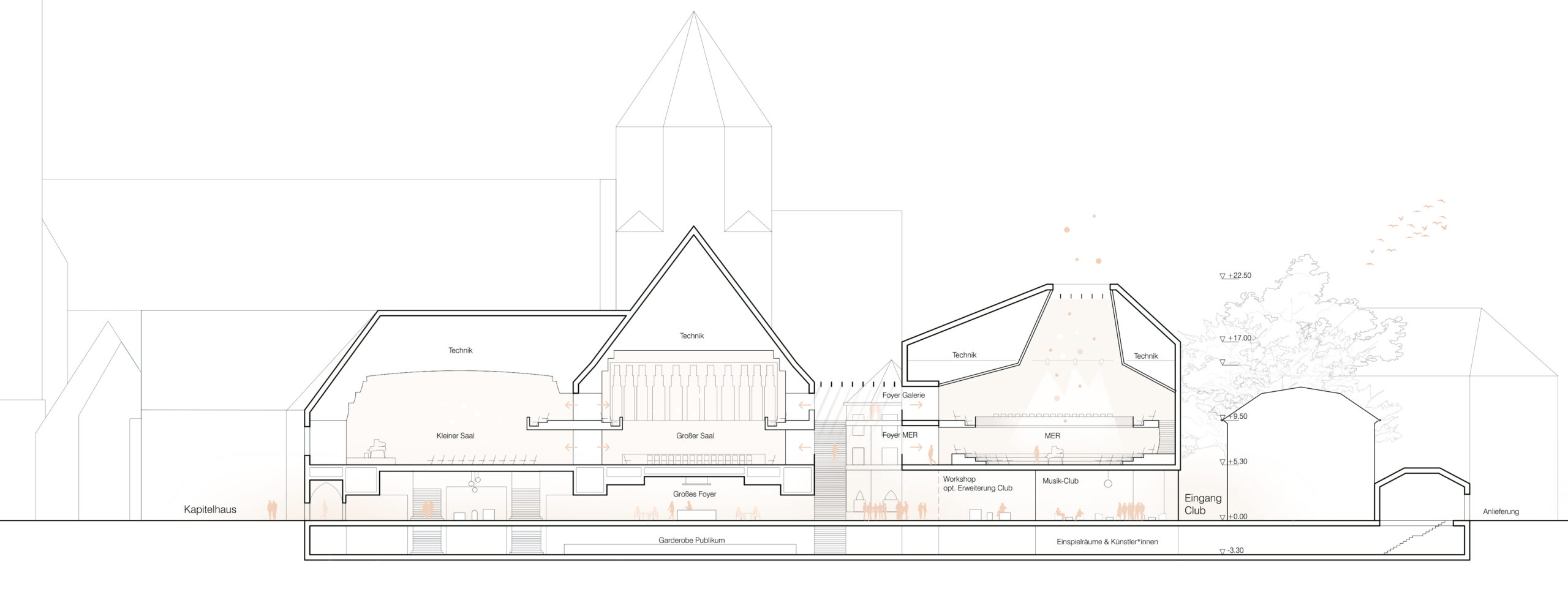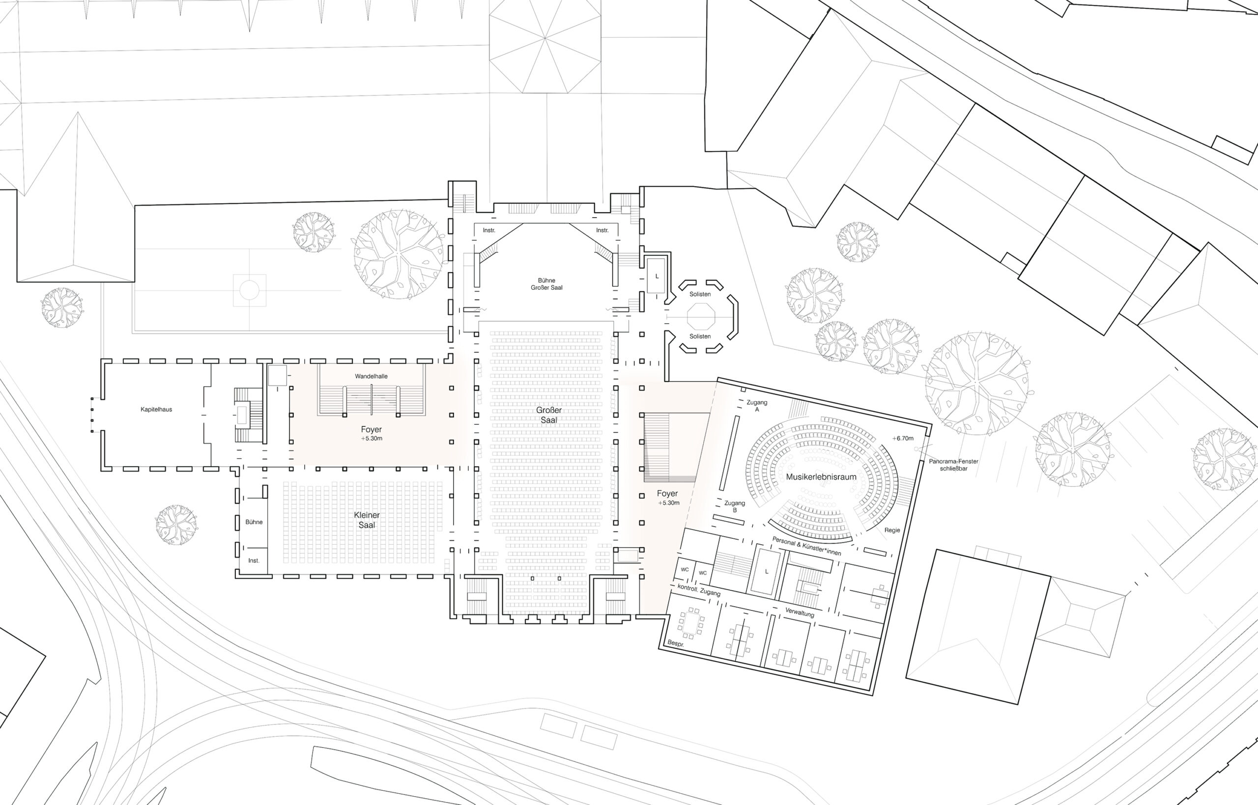 The proposal expands Bremen’s renowned concert hall Die Glocke by carefully embedding a new volume into the historic context of Domsheide. A clear geometric form connects to the existing building through a transparent glass joint, preserving and integrating listed façades and reinforcing the continuity of the urban block. The new pitched copper roofs echo Bremen’s characteristic roofscape, anchoring the extension within the city’s silhouette while establishing a distinct contemporary identity. Strategic façade openings create visual dialogue with the surrounding public spaces and reveal the musical life inside. The project centers on a new “Musikerlebnisraum” with an elliptical seating arrangement around a predominantly central stage, fostering intimacy between performers and audience. A light-filled foyer atrium links the historic halls and the new space, allowing independent and combined operation. The result is a seamless spatial continuum that strengthens Die Glocke’s cultural presence while enhancing its urban integration and architectural clarity.