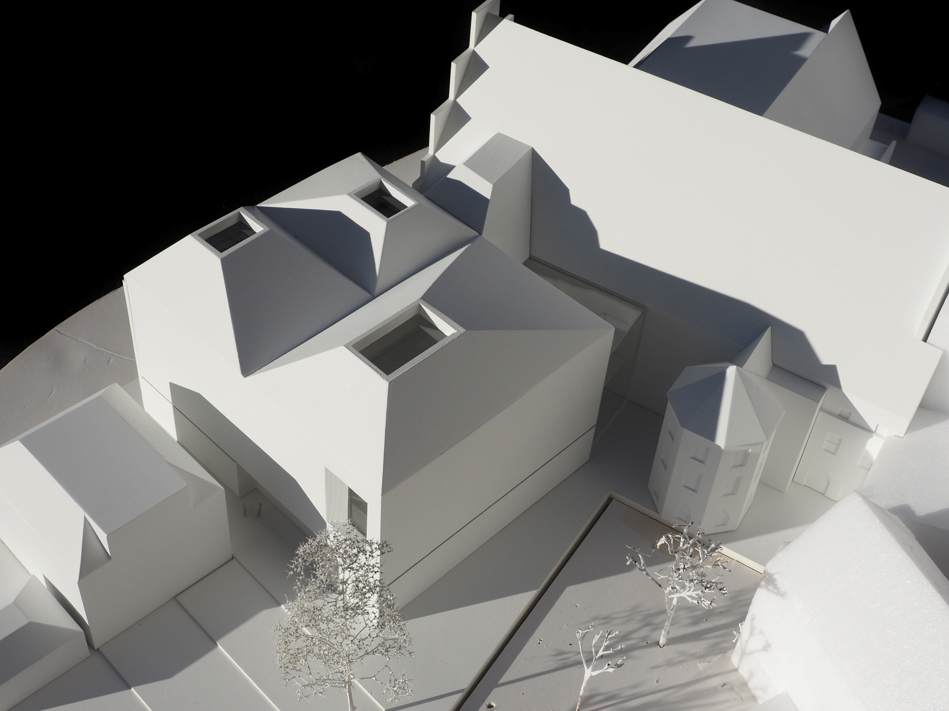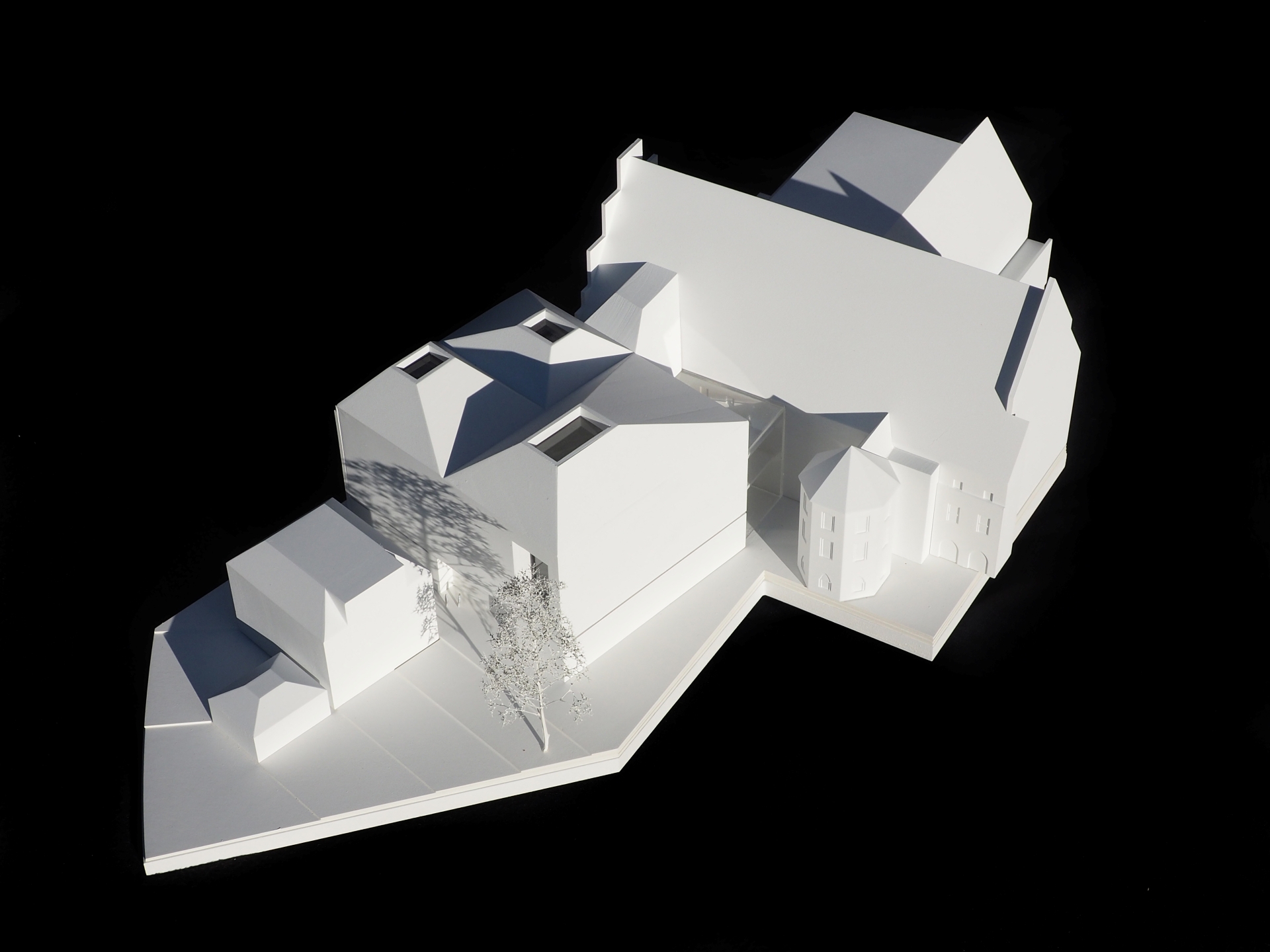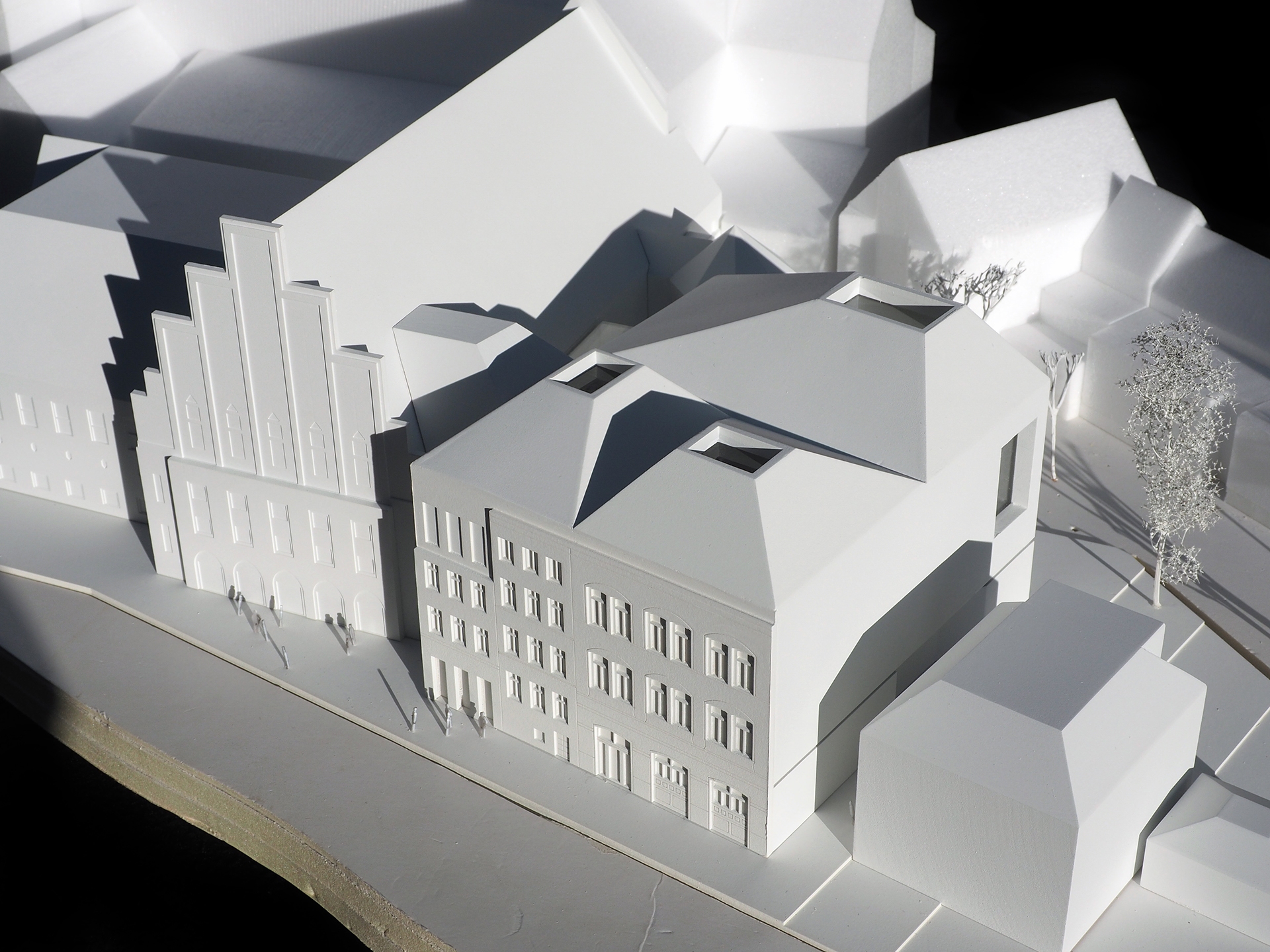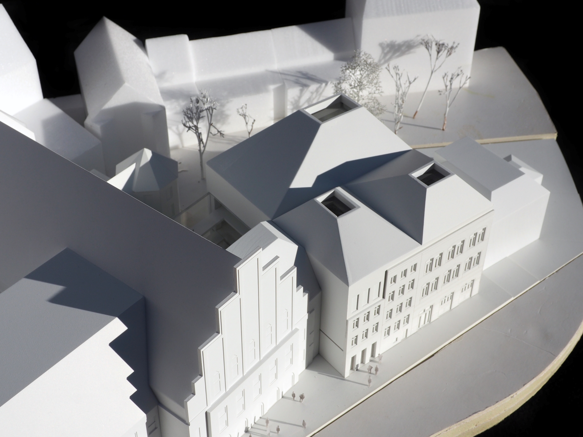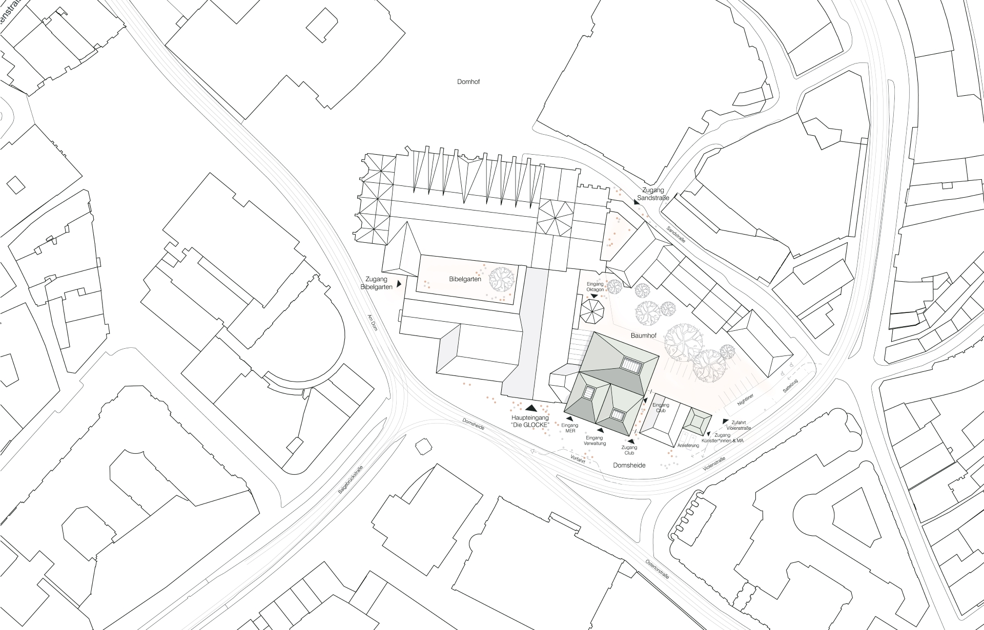 The proposal expands Bremen’s renowned concert hall Die Glocke by carefully embedding a new volume into the historic context of Domsheide. A clear geometric form connects to the existing building through a transparent glass joint, preserving and integrating listed façades and reinforcing the continuity of the urban block. The new pitched copper roofs echo Bremen’s characteristic roofscape, anchoring the extension within the city’s silhouette while establishing a distinct contemporary identity. Strategic façade openings create visual dialogue with the surrounding public spaces and reveal the musical life inside. The project centers on a new “Musikerlebnisraum” with an elliptical seating arrangement around a predominantly central stage, fostering intimacy between performers and audience. A light-filled foyer atrium links the historic halls and the new space, allowing independent and combined operation. The result is a seamless spatial continuum that strengthens Die Glocke’s cultural presence while enhancing its urban integration and architectural clarity.