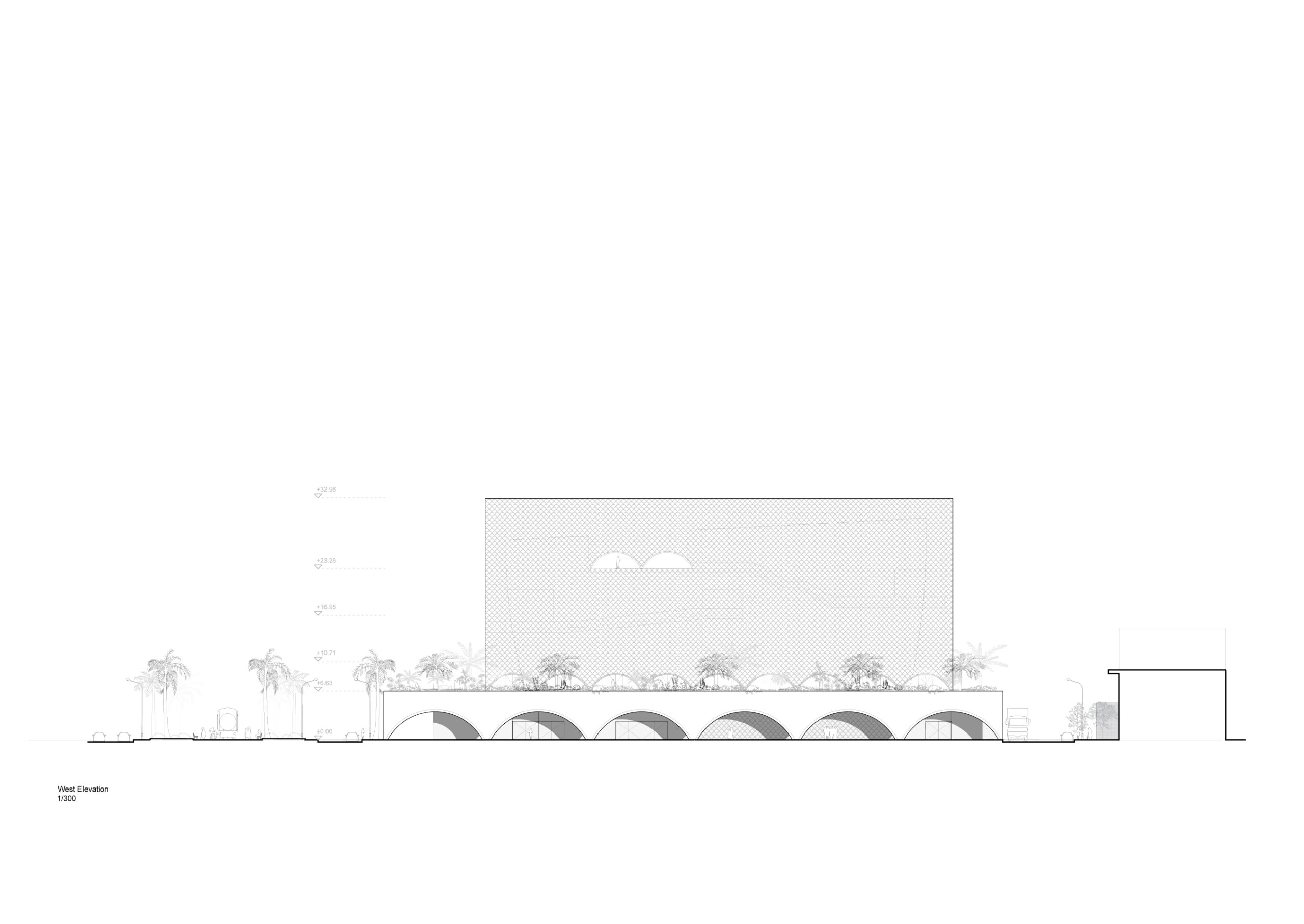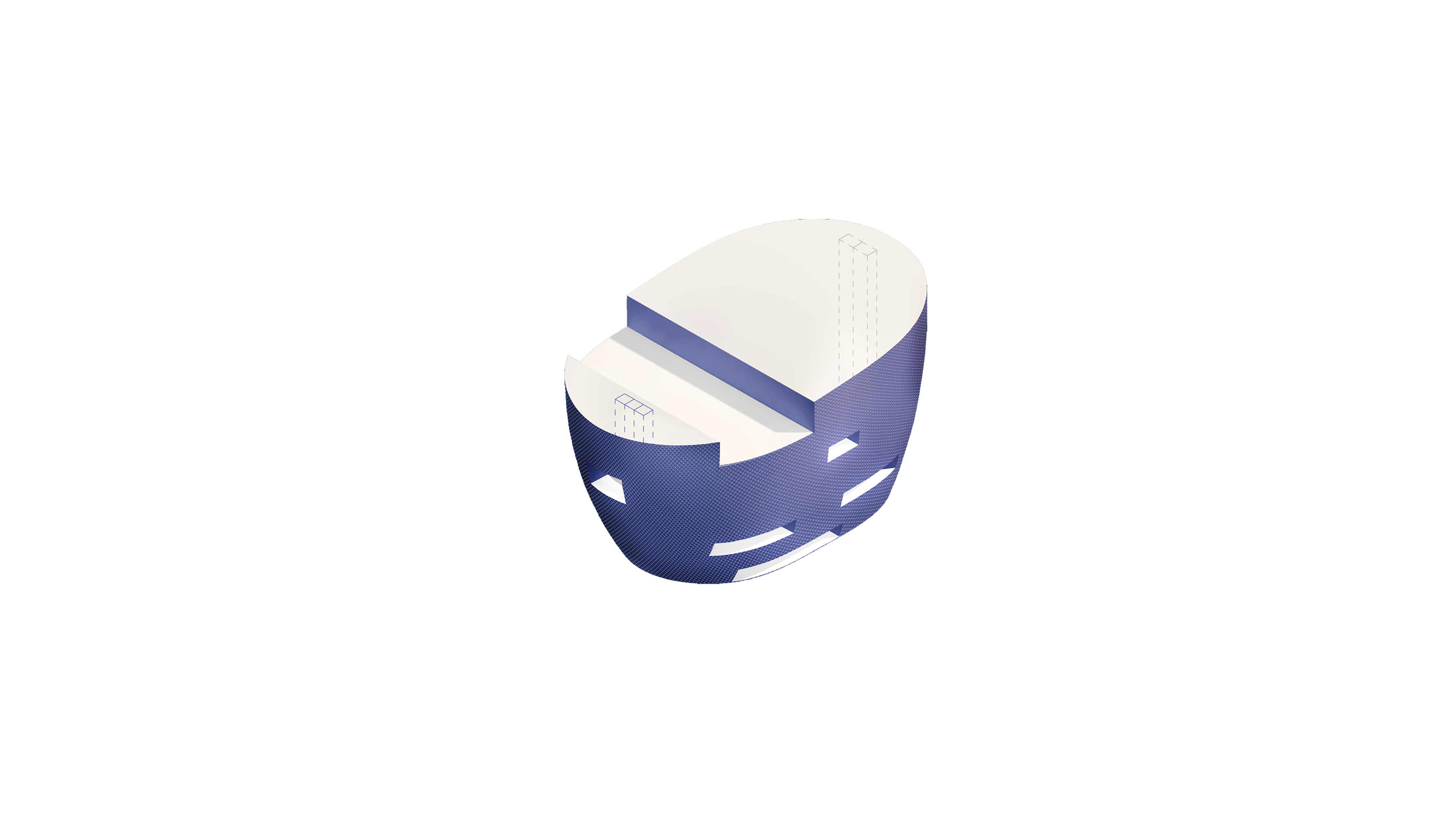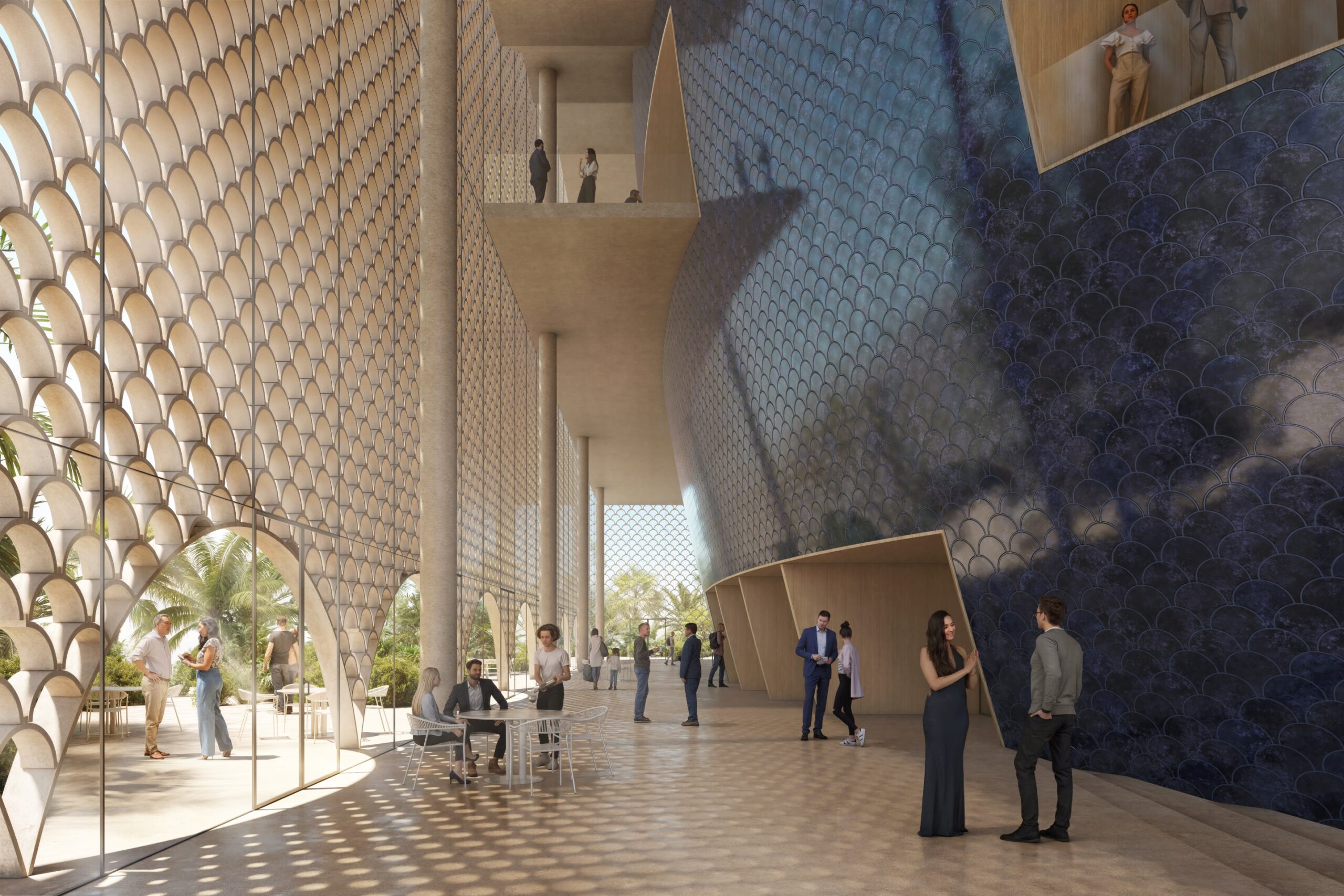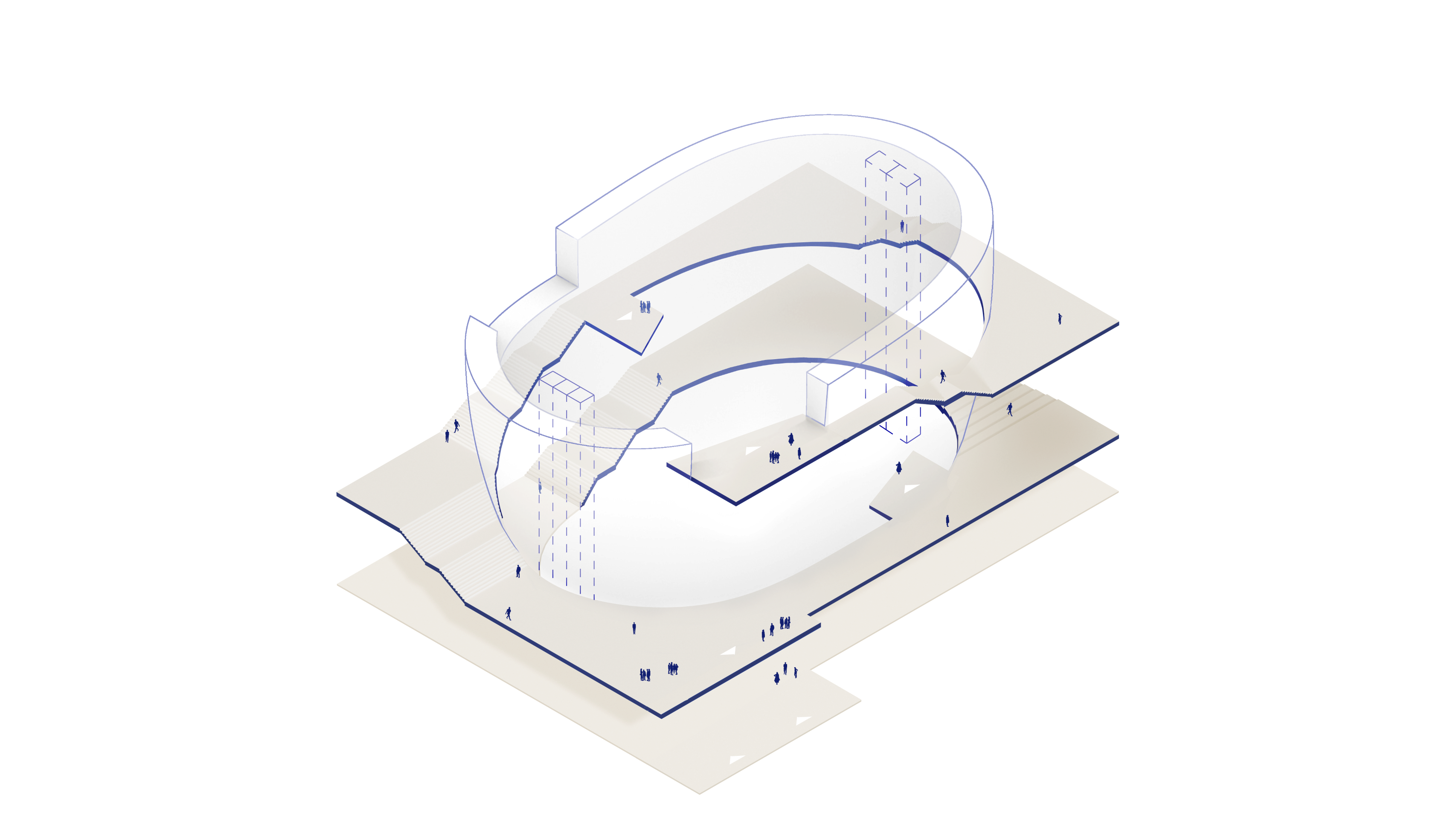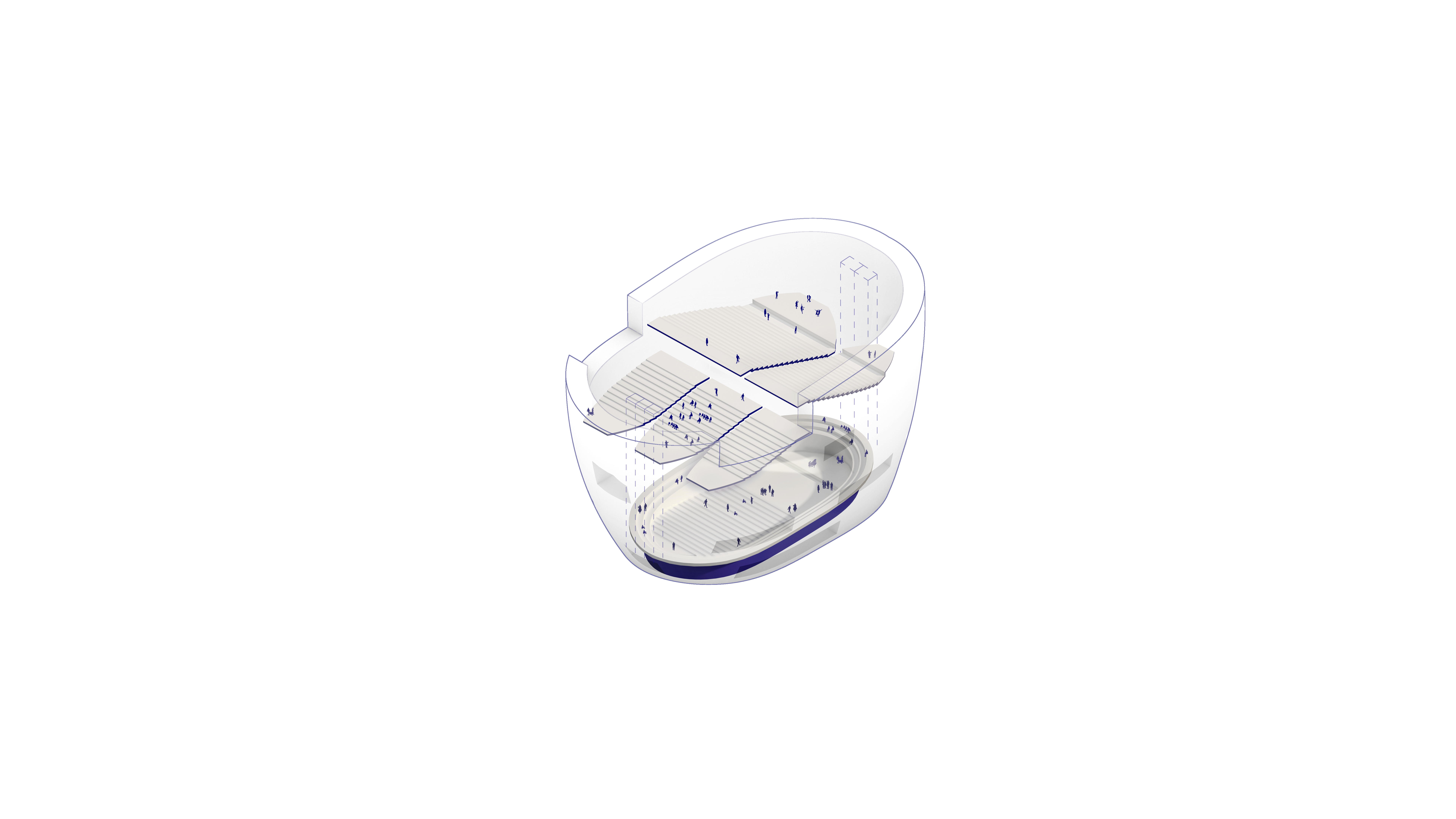 The Elche Congress Centre is conceived as a civic landmark positioned at the eastern edge of the historic Palmeral, acting as a mediator between landscape and city. The building occupies the perimeter of the site, creating a strong urban edge while opening a new public square to the northwest—an entrance plaza that connects pedestrian flows from the city, the university, and public transport. A shaded limestone plinth with Mediterranean arches anchors the project to the ground and generates a continuous public portico that extends the urban realm. Above this base, a ceramic lattice volume filters light and heat, reinterpreting traditional local craftsmanship as a contemporary climatic device. At its core, a glazed blue oval volume houses the stacked congress halls, forming the symbolic and spatial heart of the building. A helicoidal ascending foyer wraps around this central form, guiding visitors upward toward landscaped terraces overlooking the Palmeral. The project merges urban articulation, climatic intelligence, and tectonic clarity, establishing a new cultural node that activates its surroundings while remaining deeply rooted in Elche’s material and landscape identity.