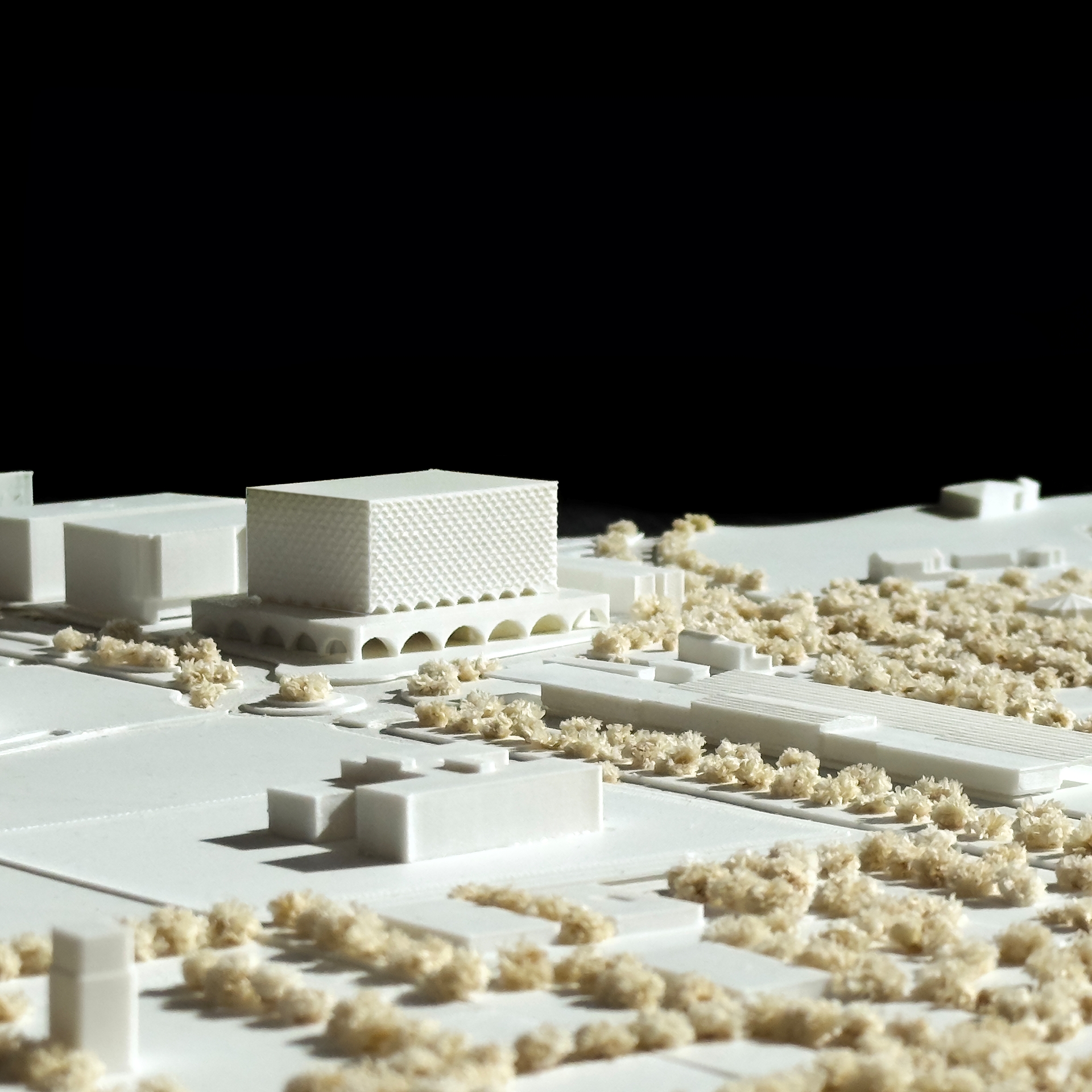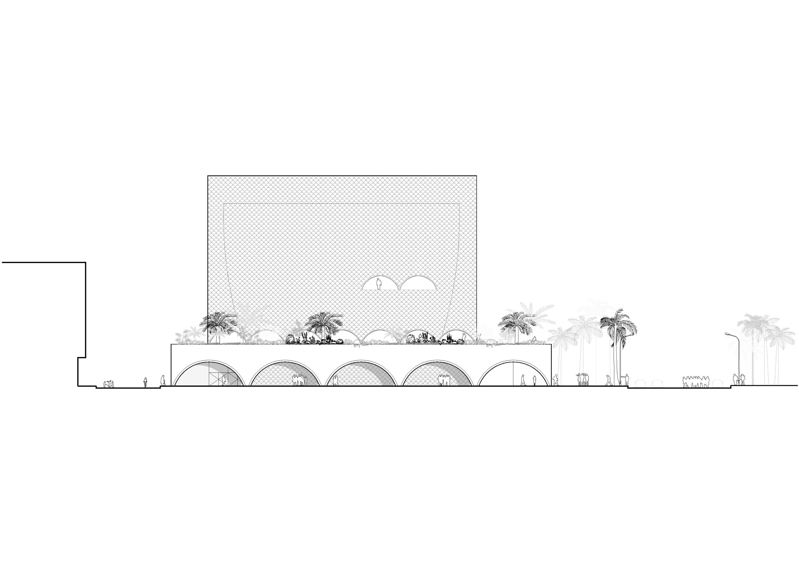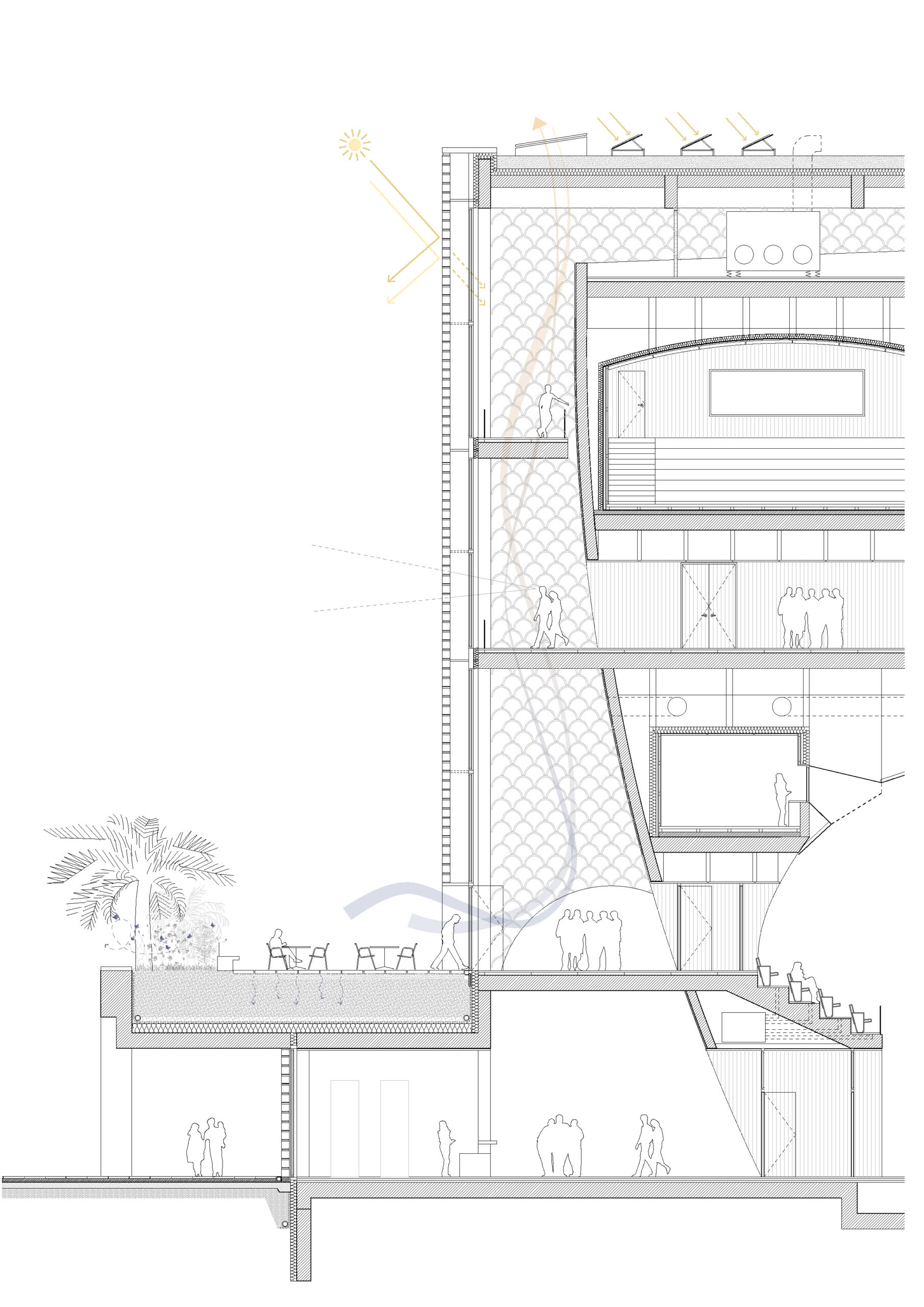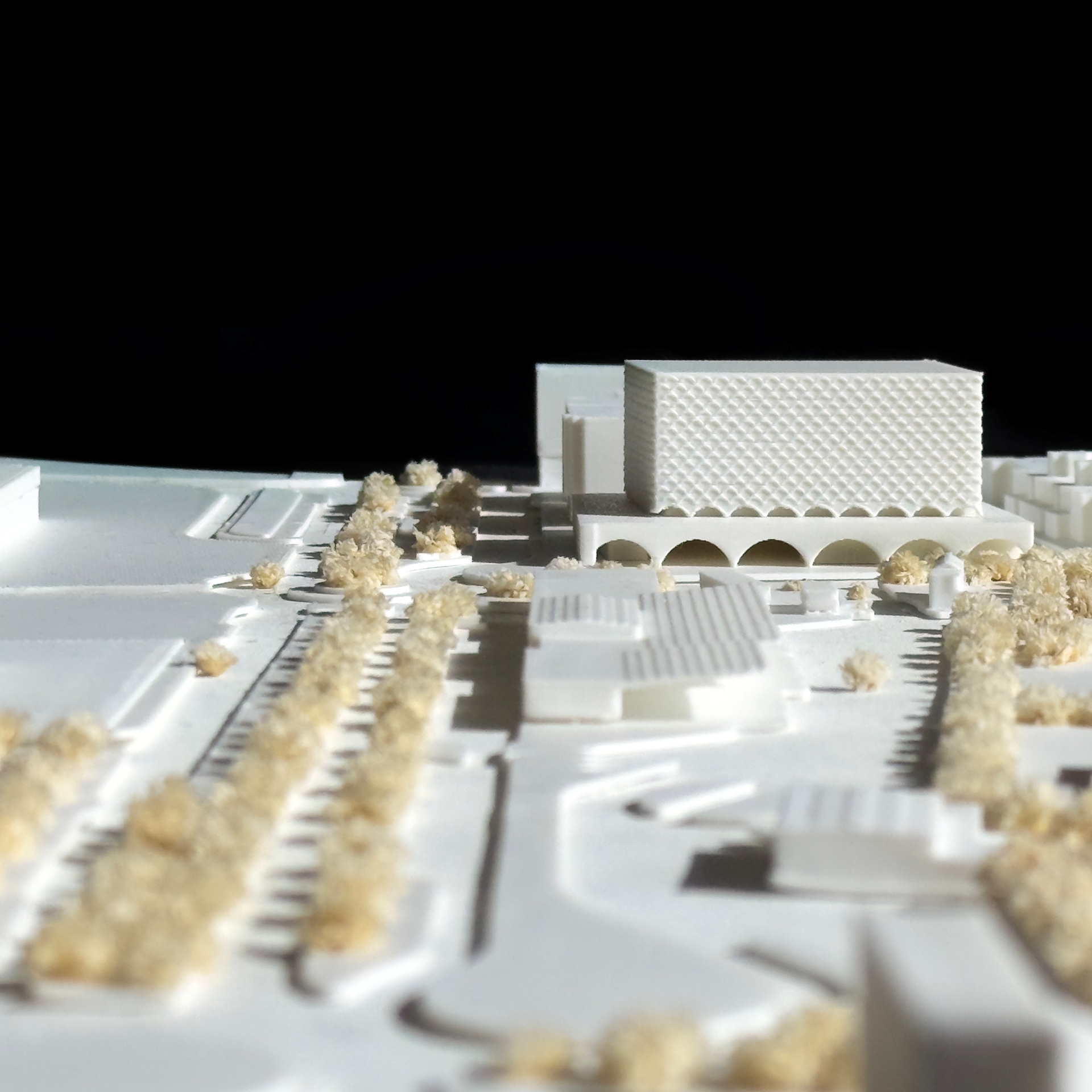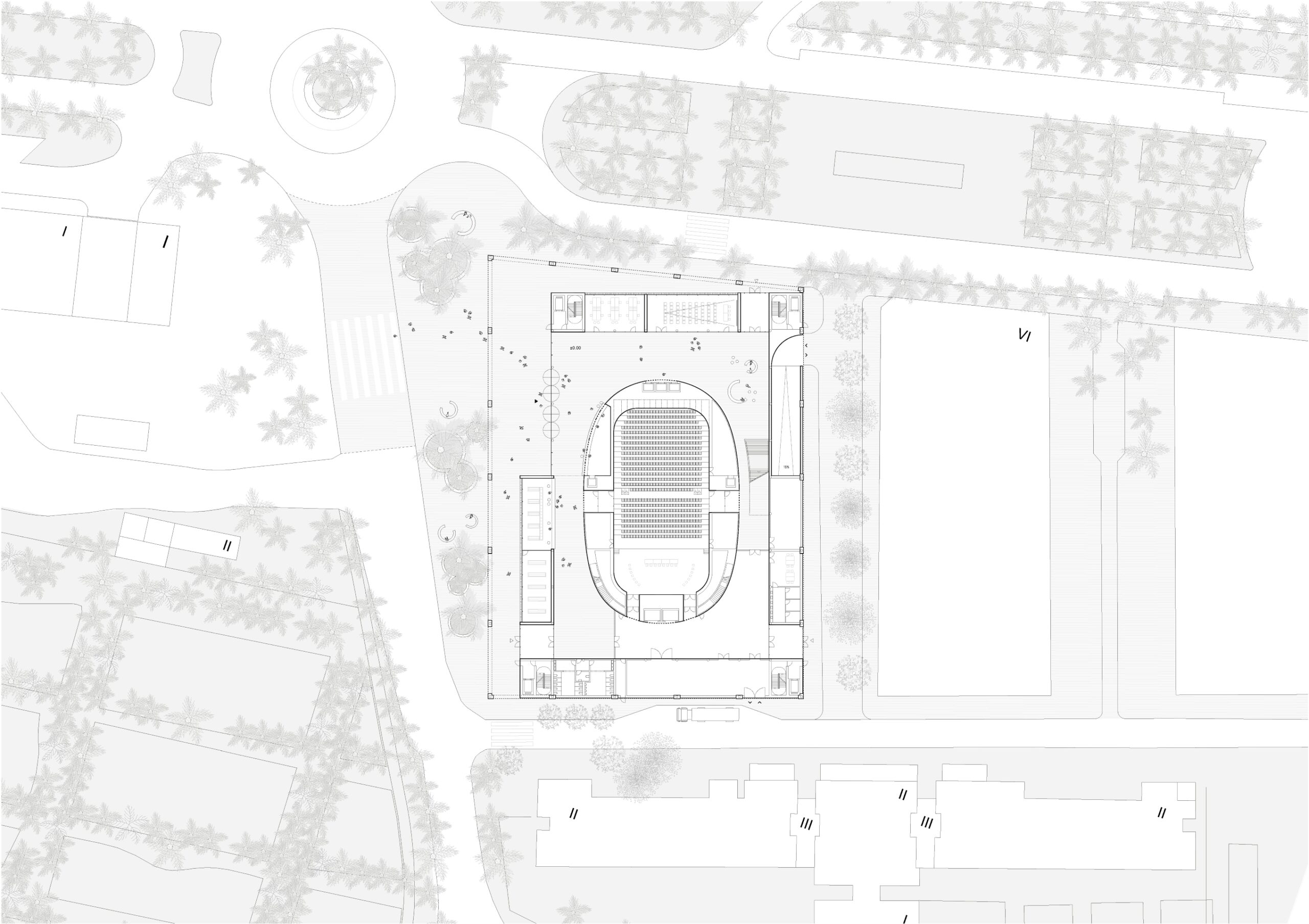 The Elche Congress Centre is conceived as a civic landmark positioned at the eastern edge of the historic Palmeral, acting as a mediator between landscape and city. The building occupies the perimeter of the site, creating a strong urban edge while opening a new public square to the northwest—an entrance plaza that connects pedestrian flows from the city, the university, and public transport. A shaded limestone plinth with Mediterranean arches anchors the project to the ground and generates a continuous public portico that extends the urban realm. Above this base, a ceramic lattice volume filters light and heat, reinterpreting traditional local craftsmanship as a contemporary climatic device. At its core, a glazed blue oval volume houses the stacked congress halls, forming the symbolic and spatial heart of the building. A helicoidal ascending foyer wraps around this central form, guiding visitors upward toward landscaped terraces overlooking the Palmeral. The project merges urban articulation, climatic intelligence, and tectonic clarity, establishing a new cultural node that activates its surroundings while remaining deeply rooted in Elche’s material and landscape identity.