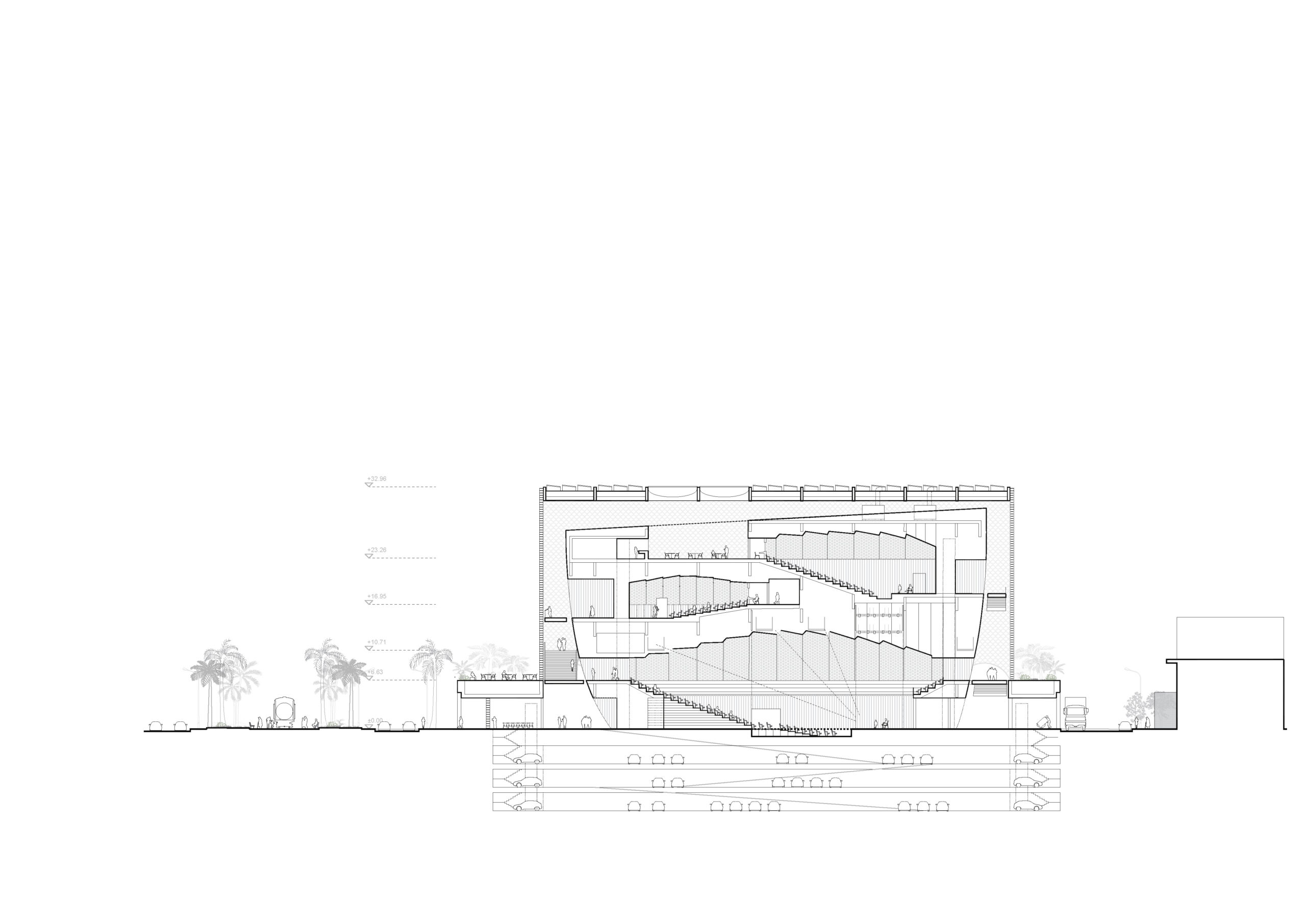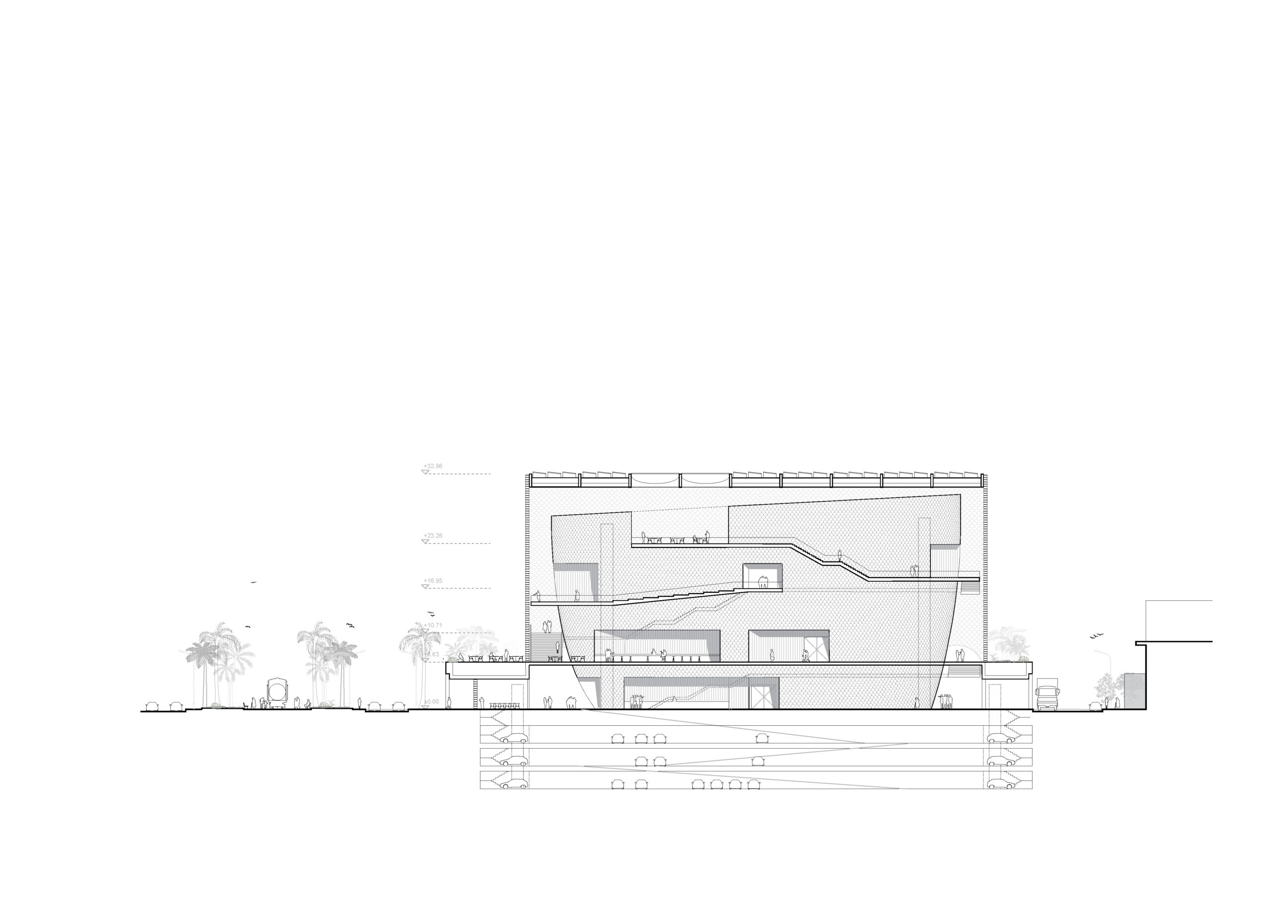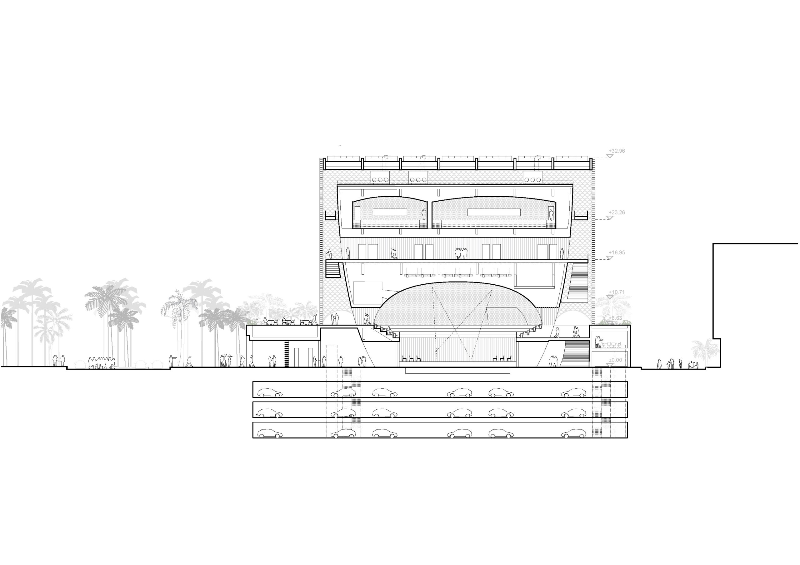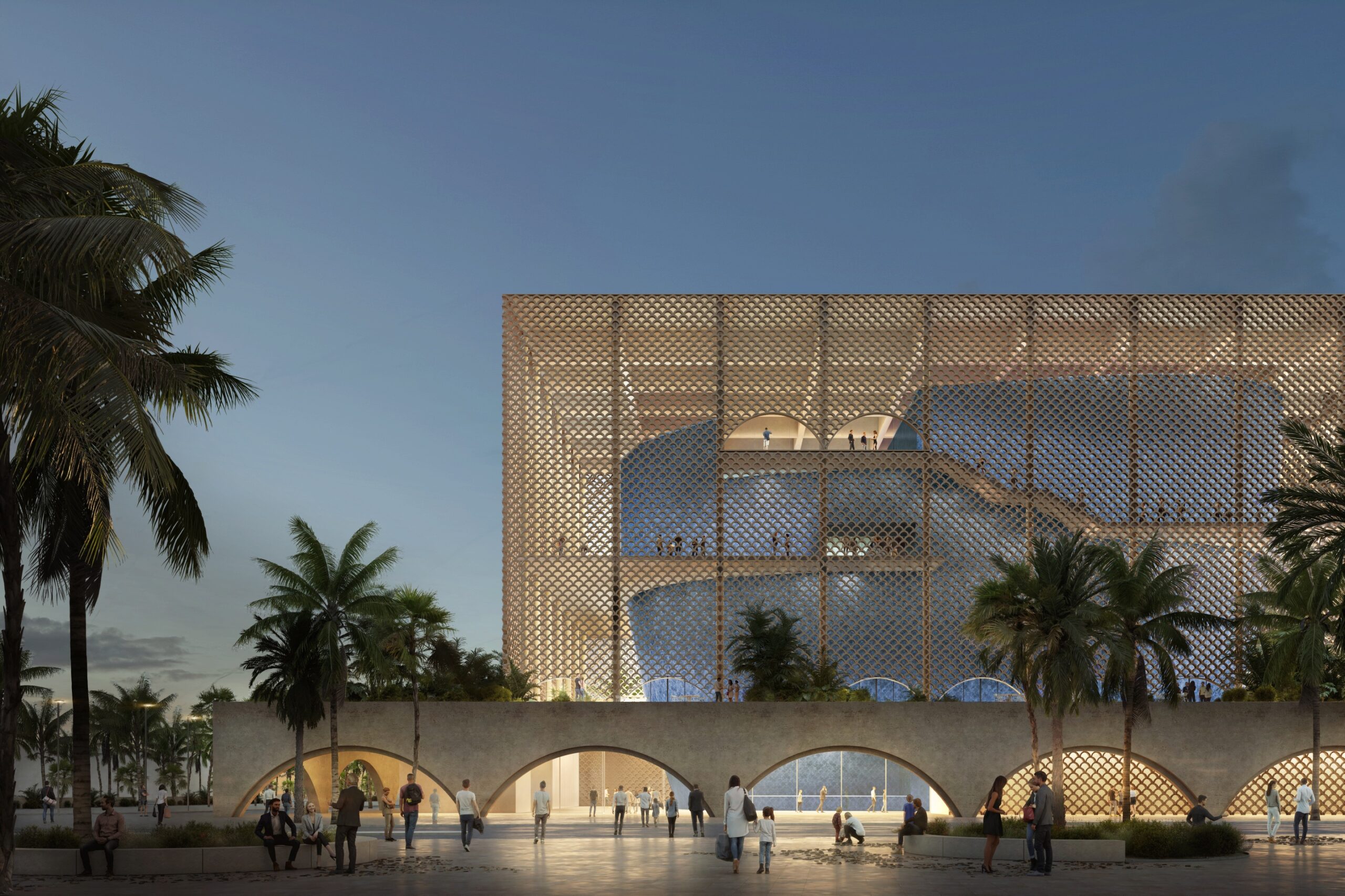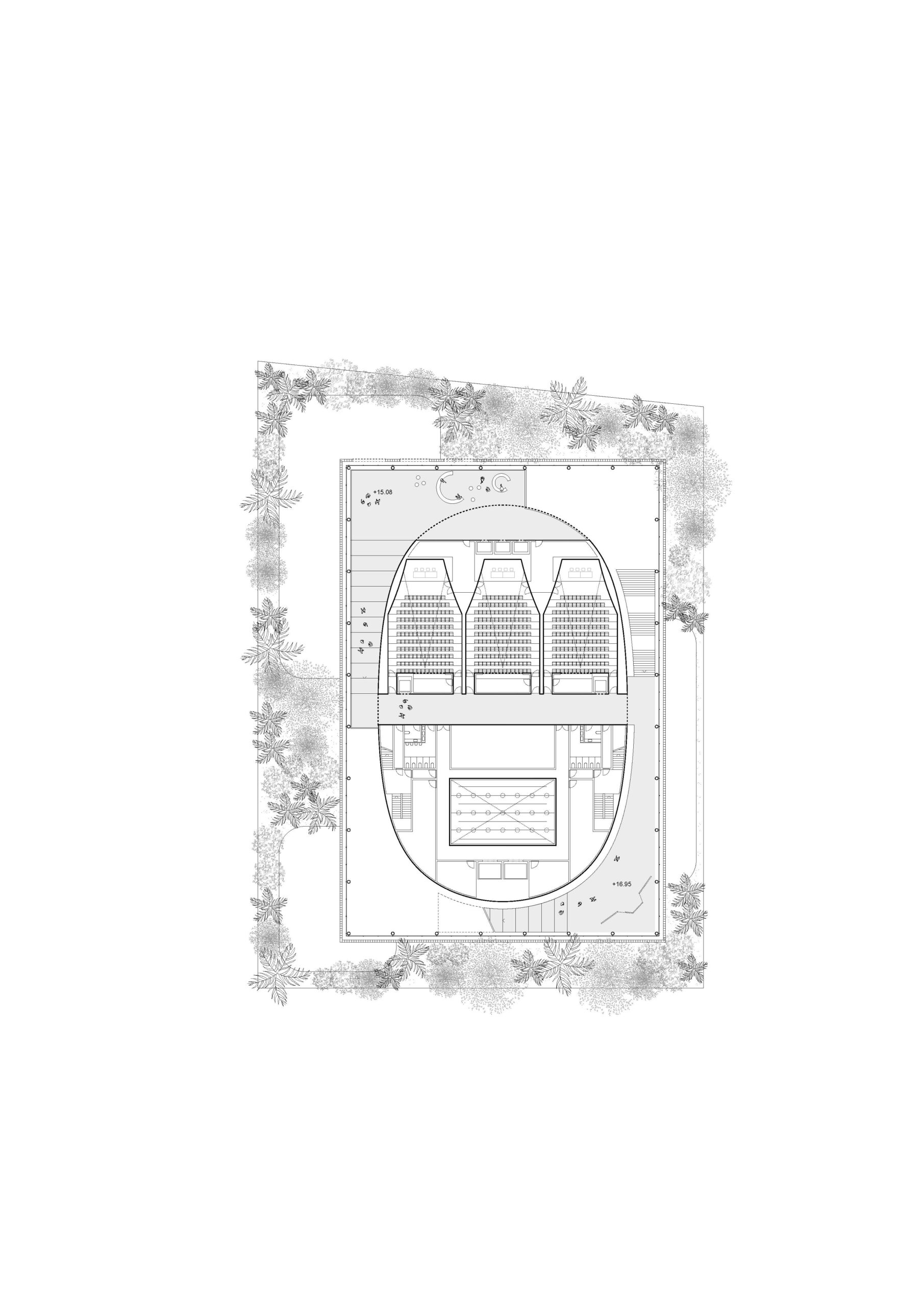 The Elche Congress Centre is conceived as a civic landmark positioned at the eastern edge of the historic Palmeral, acting as a mediator between landscape and city. The building occupies the perimeter of the site, creating a strong urban edge while opening a new public square to the northwest—an entrance plaza that connects pedestrian flows from the city, the university, and public transport. A shaded limestone plinth with Mediterranean arches anchors the project to the ground and generates a continuous public portico that extends the urban realm. Above this base, a ceramic lattice volume filters light and heat, reinterpreting traditional local craftsmanship as a contemporary climatic device. At its core, a glazed blue oval volume houses the stacked congress halls, forming the symbolic and spatial heart of the building. A helicoidal ascending foyer wraps around this central form, guiding visitors upward toward landscaped terraces overlooking the Palmeral. The project merges urban articulation, climatic intelligence, and tectonic clarity, establishing a new cultural node that activates its surroundings while remaining deeply rooted in Elche’s material and landscape identity.