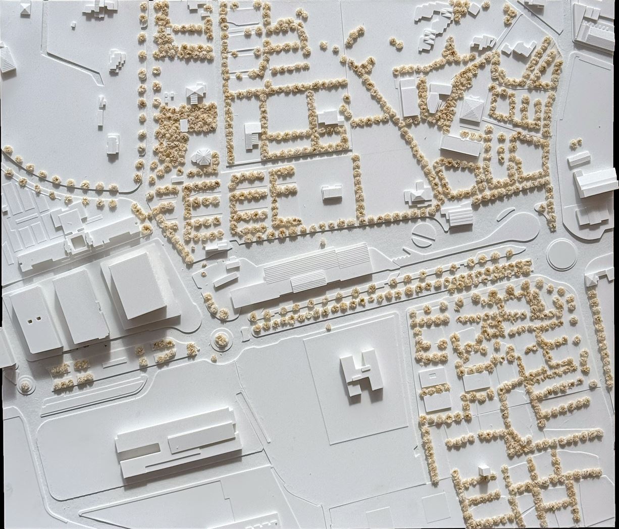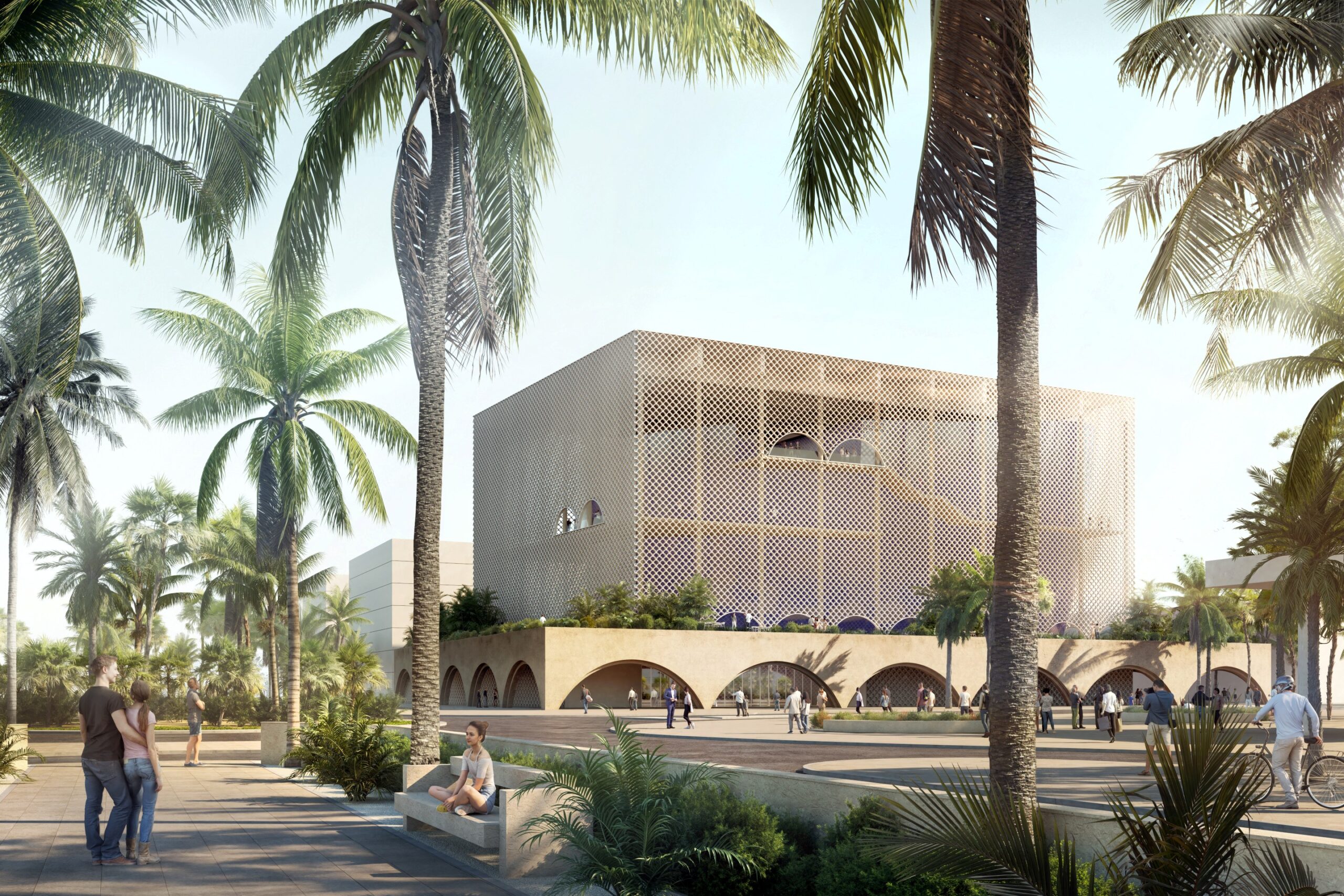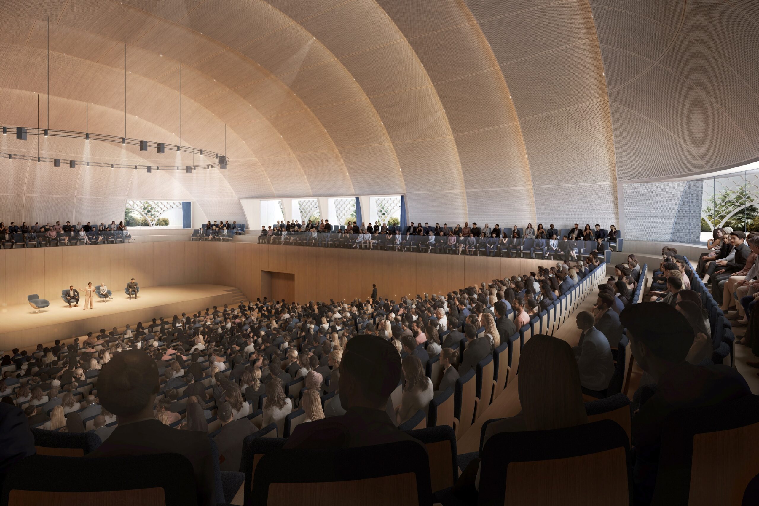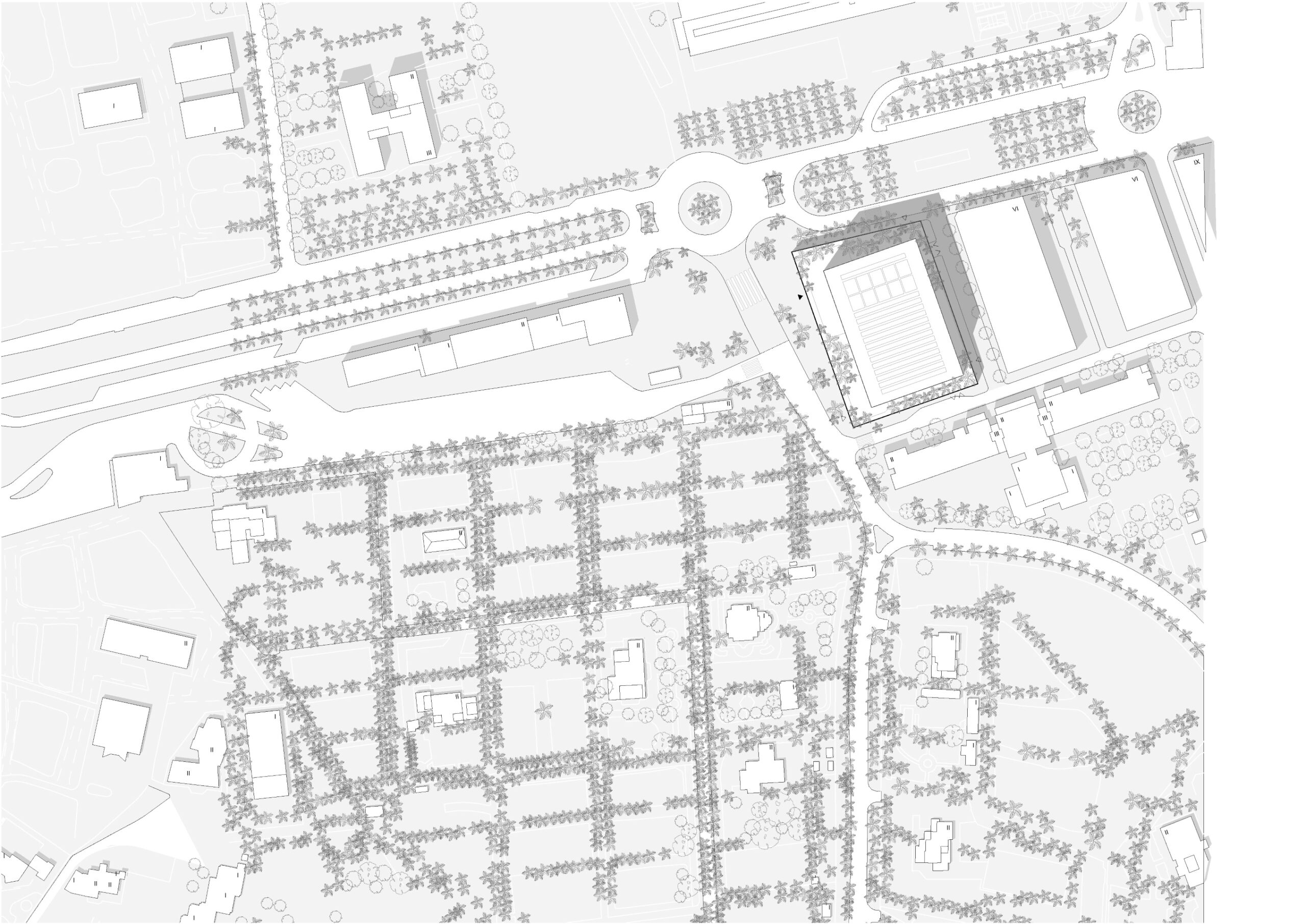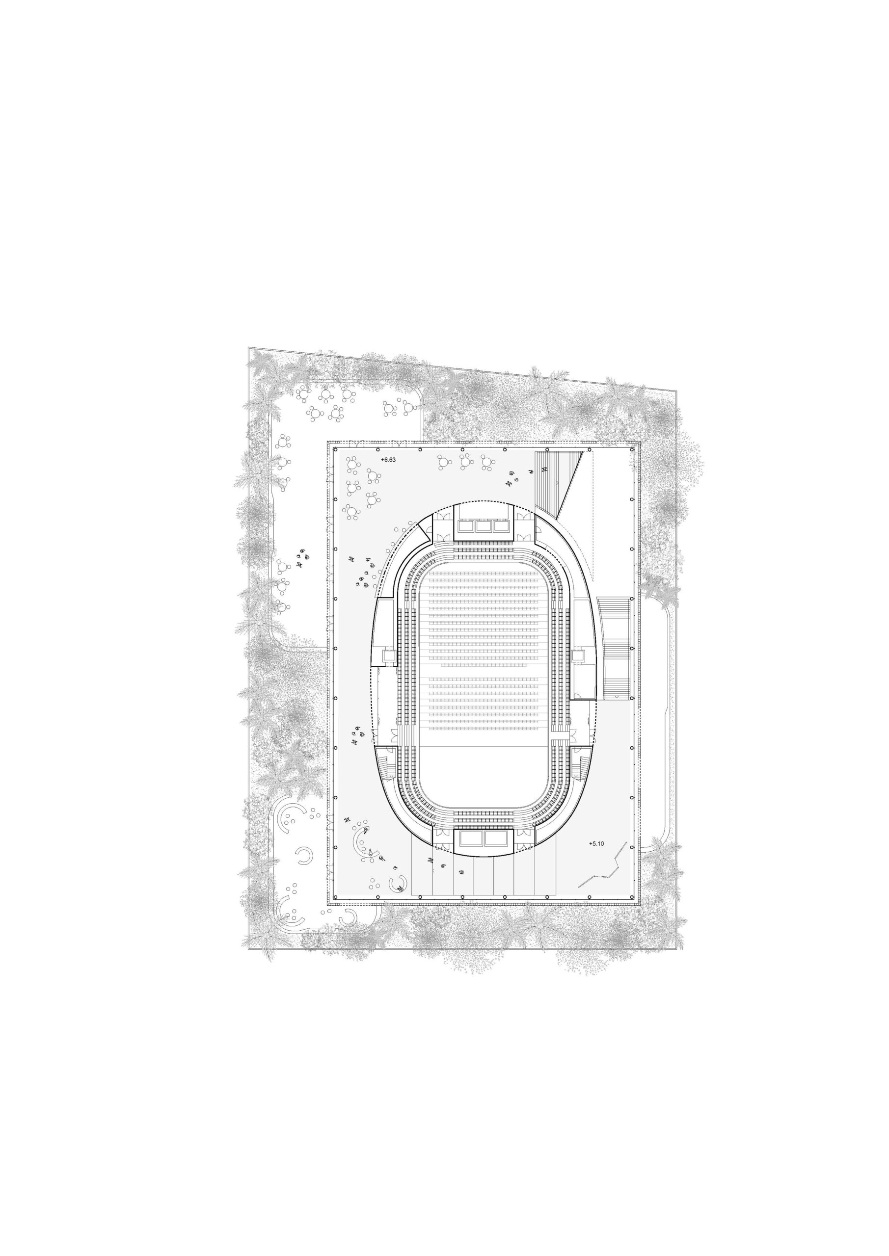 The Elche Congress Centre is conceived as a civic landmark positioned at the eastern edge of the historic Palmeral, acting as a mediator between landscape and city. The building occupies the perimeter of the site, creating a strong urban edge while opening a new public square to the northwest—an entrance plaza that connects pedestrian flows from the city, the university, and public transport. A shaded limestone plinth with Mediterranean arches anchors the project to the ground and generates a continuous public portico that extends the urban realm. Above this base, a ceramic lattice volume filters light and heat, reinterpreting traditional local craftsmanship as a contemporary climatic device. At its core, a glazed blue oval volume houses the stacked congress halls, forming the symbolic and spatial heart of the building. A helicoidal ascending foyer wraps around this central form, guiding visitors upward toward landscaped terraces overlooking the Palmeral. The project merges urban articulation, climatic intelligence, and tectonic clarity, establishing a new cultural node that activates its surroundings while remaining deeply rooted in Elche’s material and landscape identity.