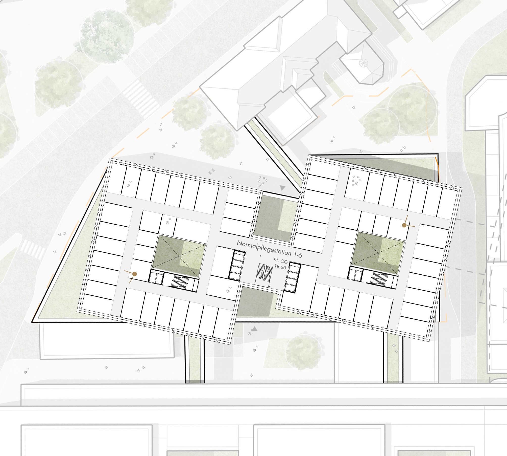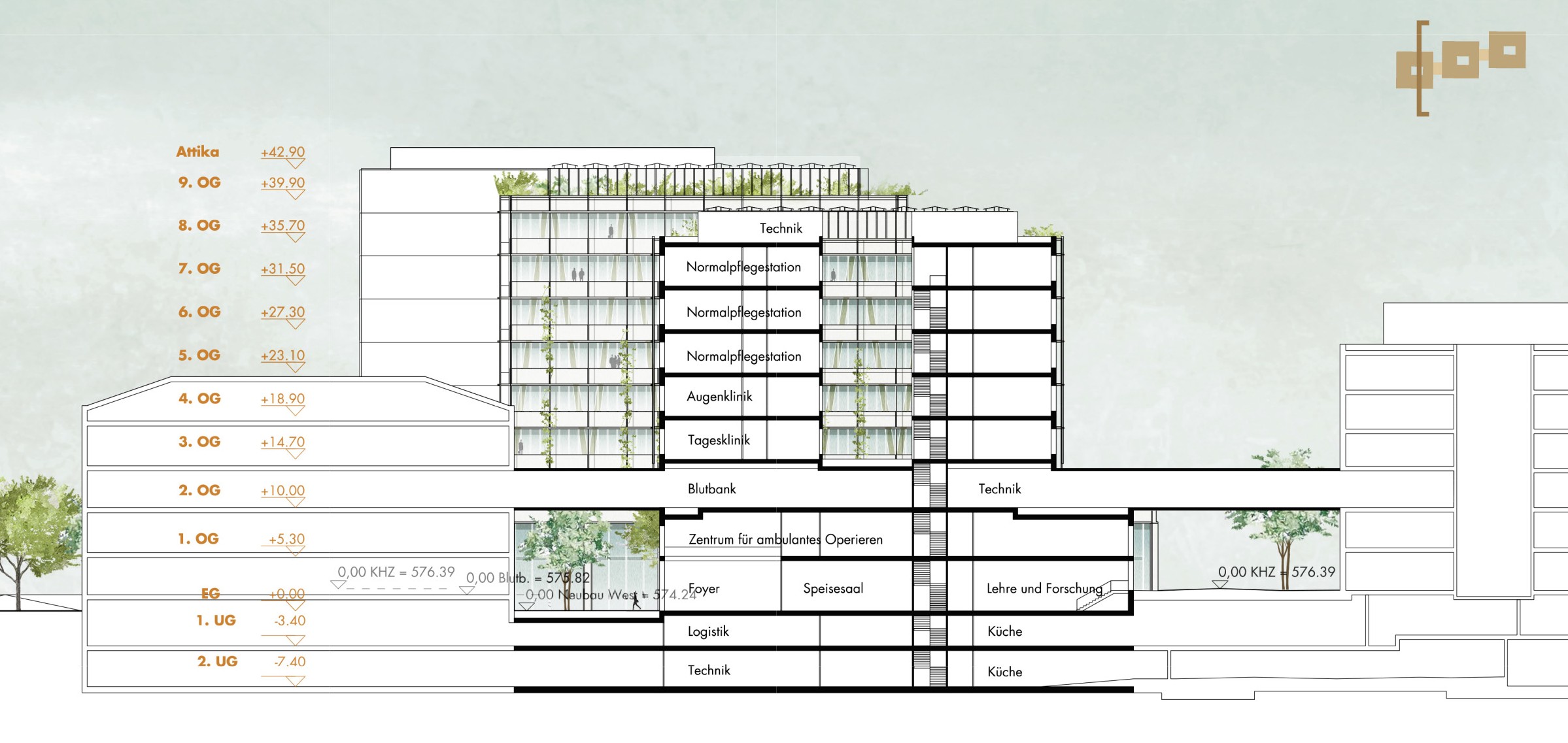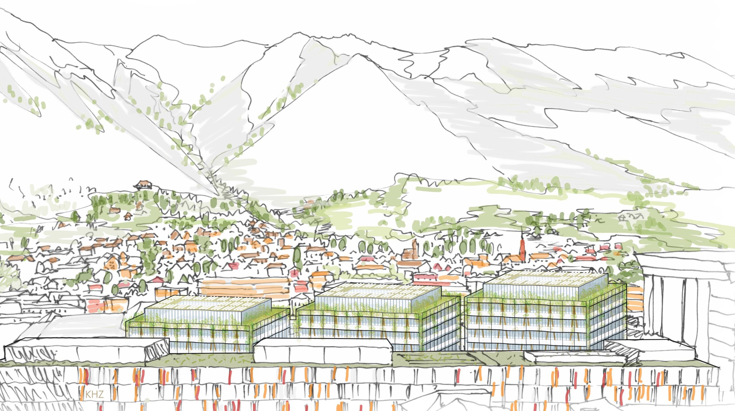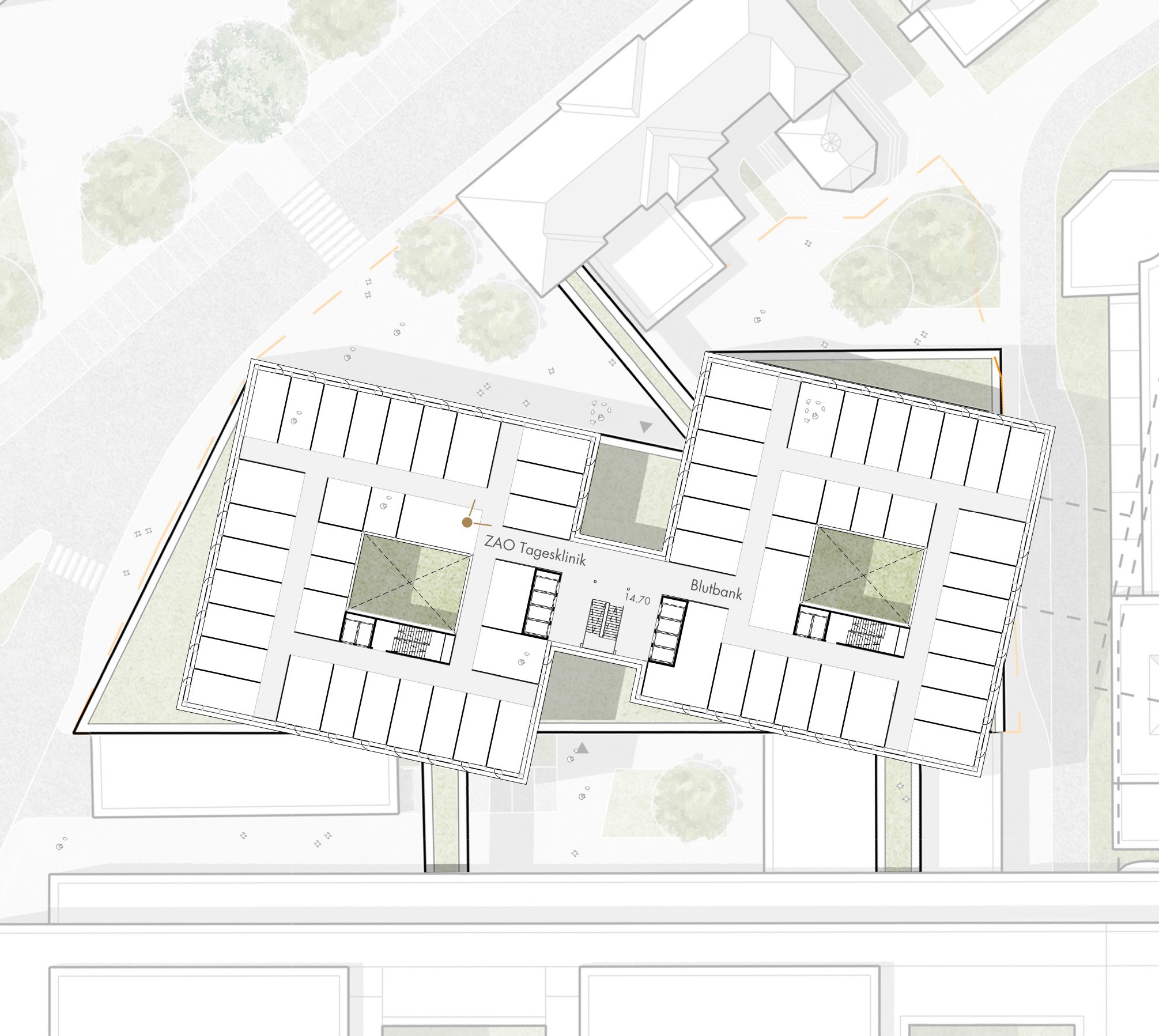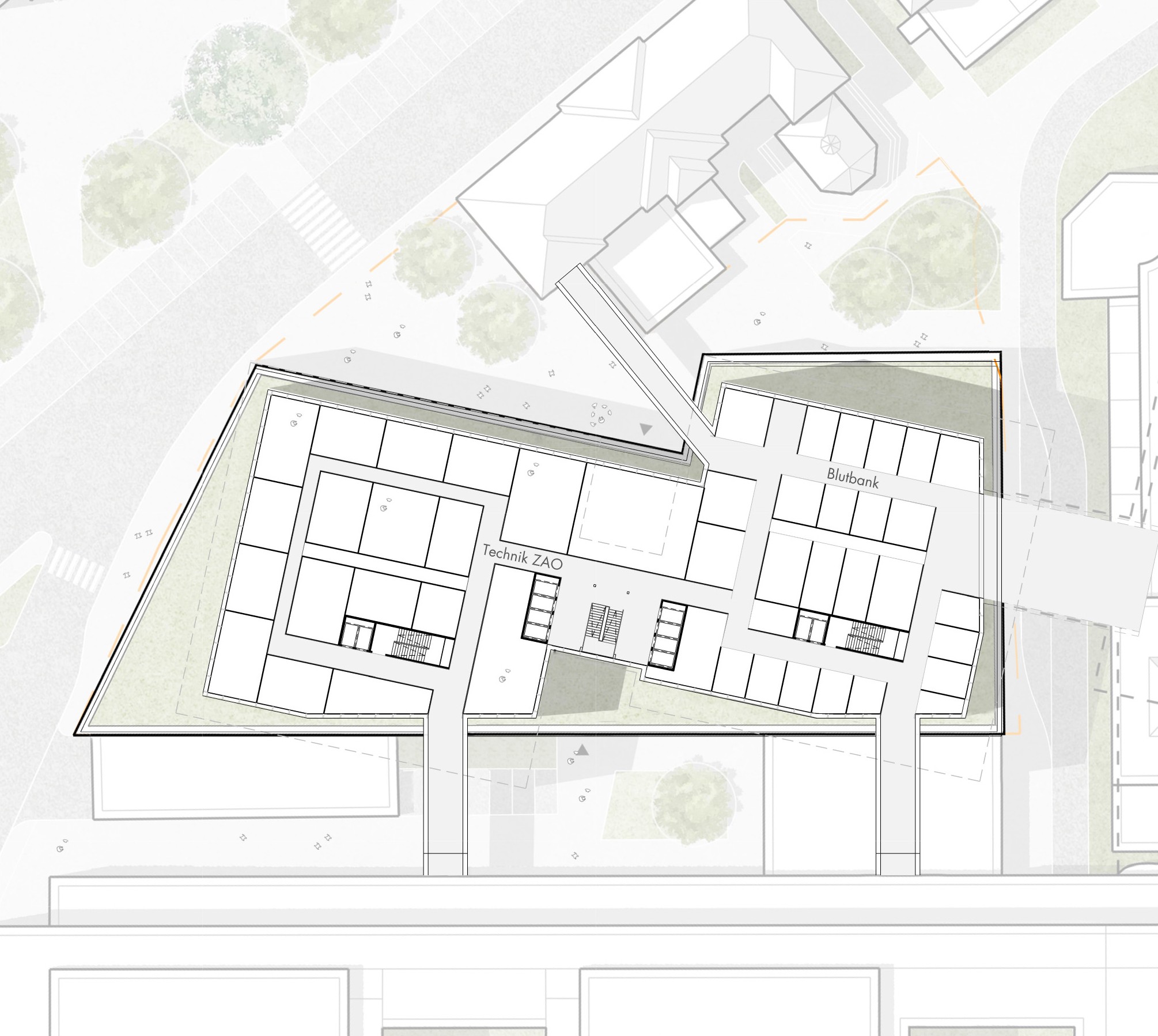 The project envisions a new hospital complex composed of several compact buildings organized on a shared podium, creating a clear and cohesive ensemble. Designed as modular and flexible structures, the buildings allow for phased construction and future adaptation. Their arrangement forms internal courtyards and green terraces, bringing in natural light, improving orientation, and strengthening the connection between interior spaces and the surrounding landscape. The urban strategy carefully integrates the complex into Innsbruck’s existing fabric. It responds to both the surrounding block structure and the openness of the mountainous landscape, establishing a defined street edge while opening toward public green spaces and pedestrian routes. This approach enhances accessibility and permeability across the site. Circulation is clearly structured, with separate flows for public, clinical, and logistical uses, alongside a legible hierarchy of entrances to support efficient navigation. Architecturally, the buildings are based on a regular structural grid and a transparent façade system, balancing efficiency with a calm, unified expression. Horizontal layering, integrated greenery, and accessible roof landscapes contribute to both environmental performance and visual coherence. Overall, the design creates a cohesive urban intervention that mediates between dense city fabric and natural surroundings, while delivering a flexible, functional, and human-centered healthcare environment.