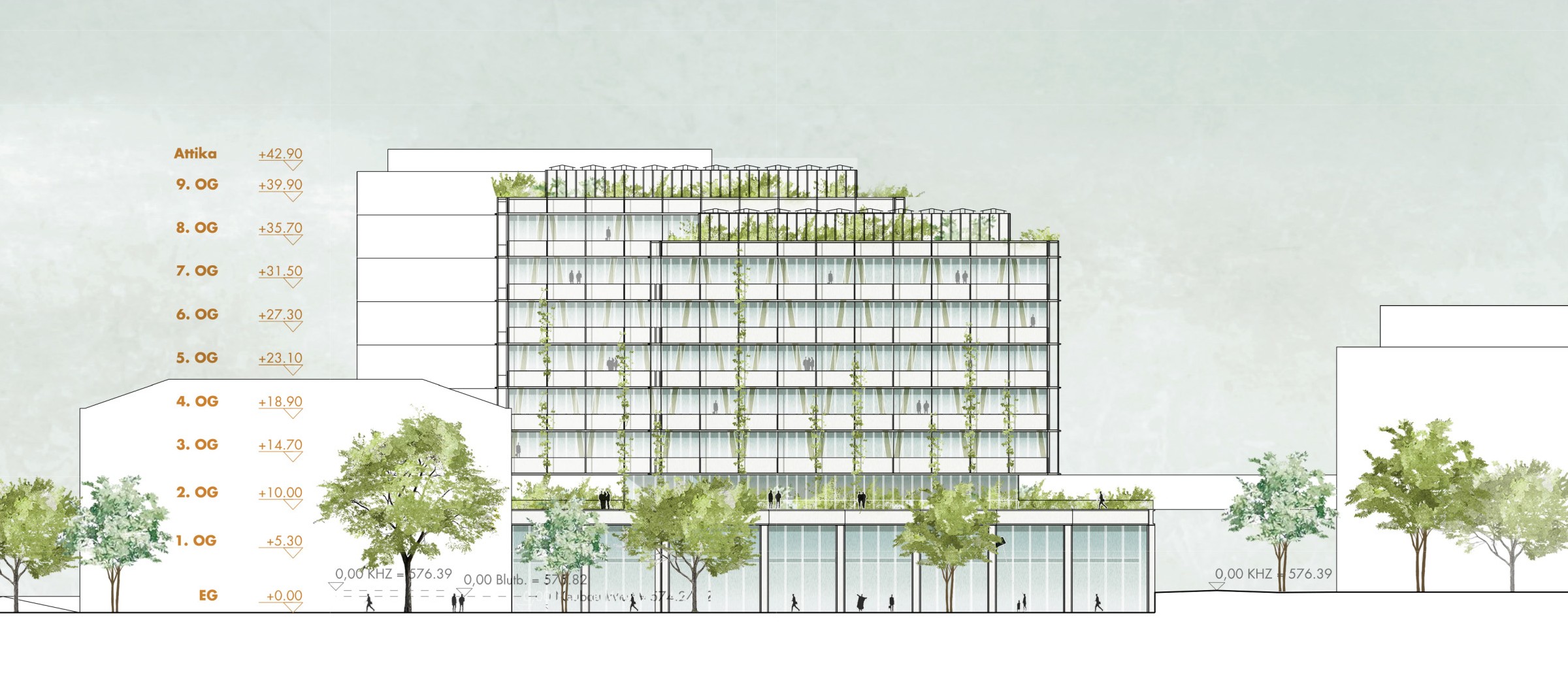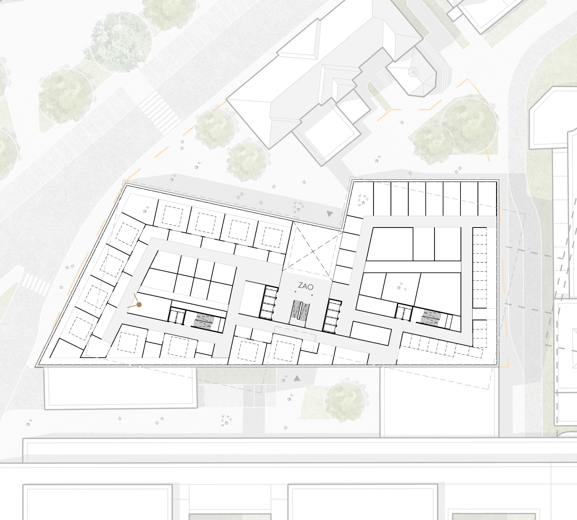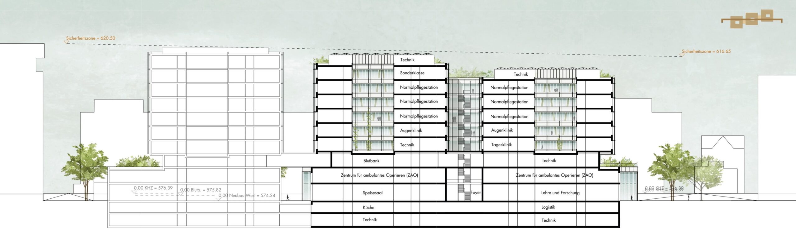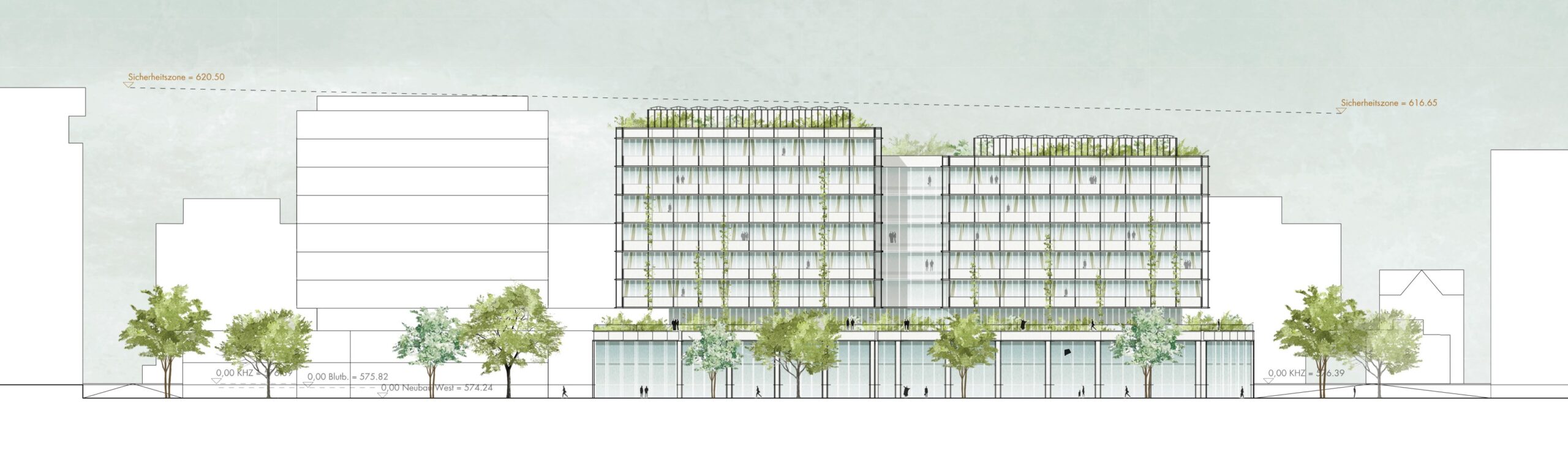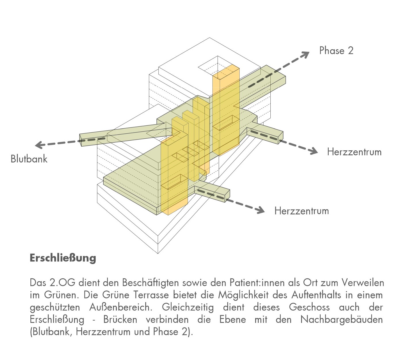The project envisions a new hospital complex composed of several compact buildings organized on a shared podium, creating a clear and cohesive ensemble. Designed as modular and flexible structures, the buildings allow for phased construction and future adaptation. Their arrangement forms internal courtyards and green terraces, bringing in natural light, improving orientation, and strengthening the connection between interior spaces and the surrounding landscape. The urban strategy carefully integrates the complex into Innsbruck’s existing fabric. It responds to both the surrounding block structure and the openness of the mountainous landscape, establishing a defined street edge while opening toward public green spaces and pedestrian routes. This approach enhances accessibility and permeability across the site. Circulation is clearly structured, with separate flows for public, clinical, and logistical uses, alongside a legible hierarchy of entrances to support efficient navigation. Architecturally, the buildings are based on a regular structural grid and a transparent façade system, balancing efficiency with a calm, unified expression. Horizontal layering, integrated greenery, and accessible roof landscapes contribute to both environmental performance and visual coherence. Overall, the design creates a cohesive urban intervention that mediates between dense city fabric and natural surroundings, while delivering a flexible, functional, and human-centered healthcare environment.