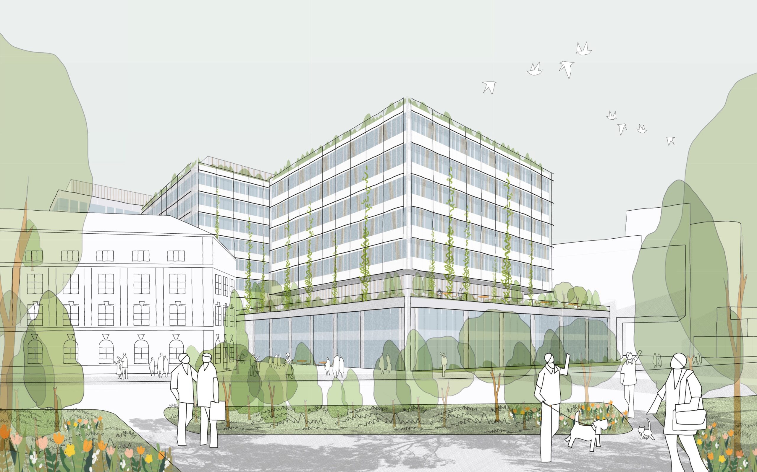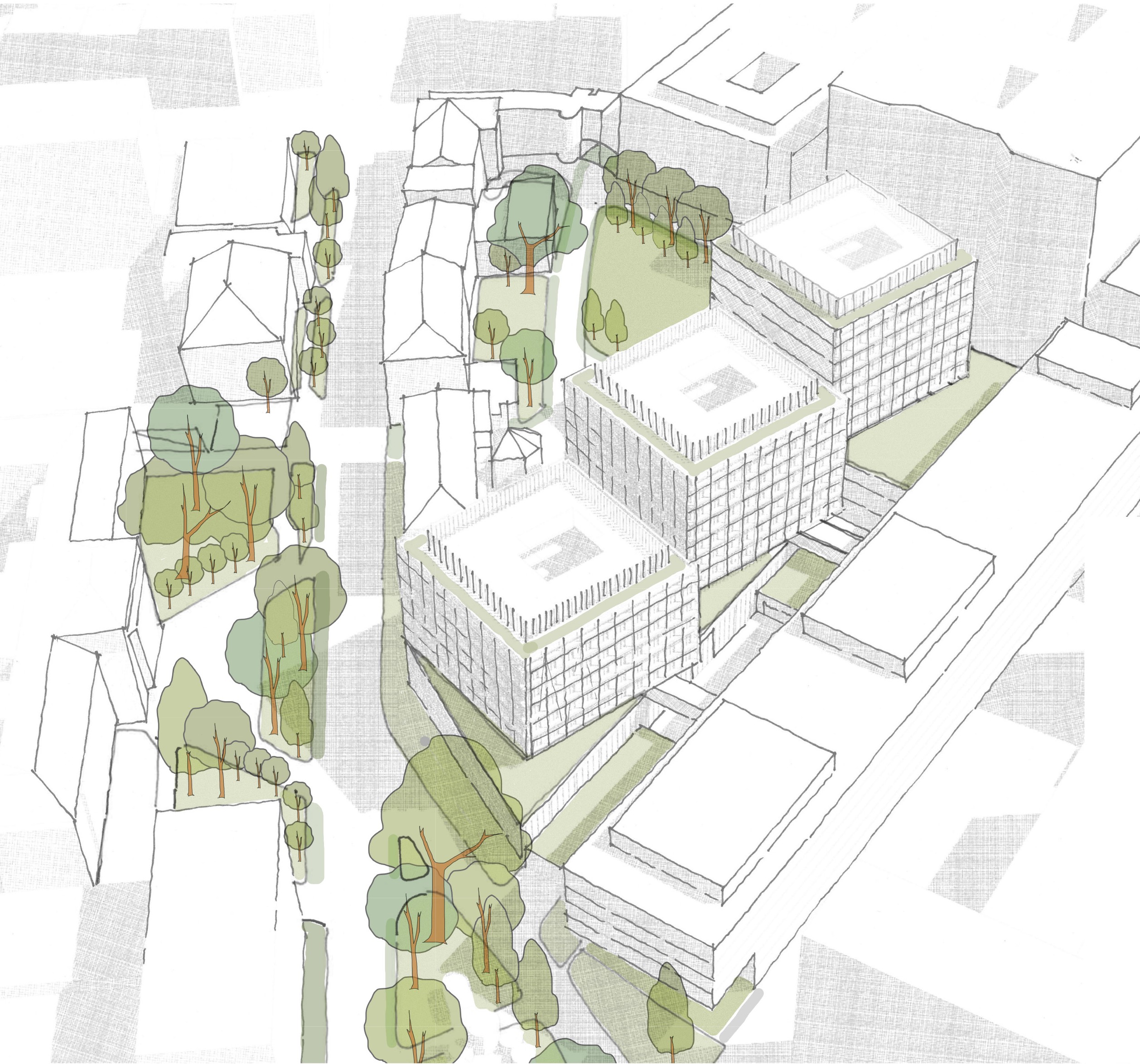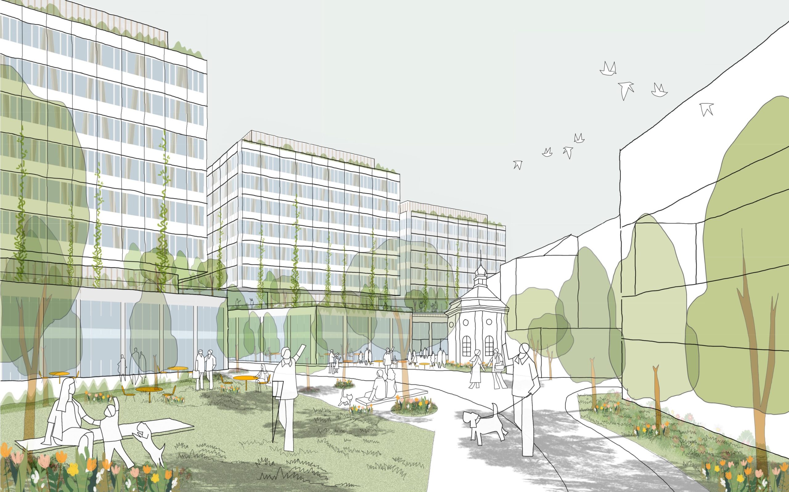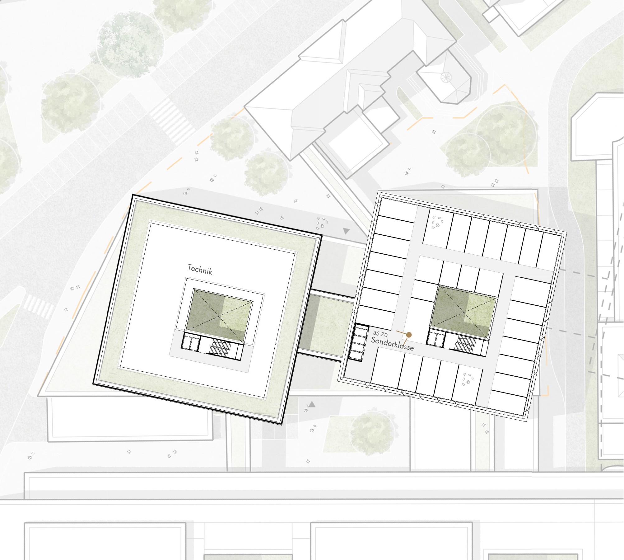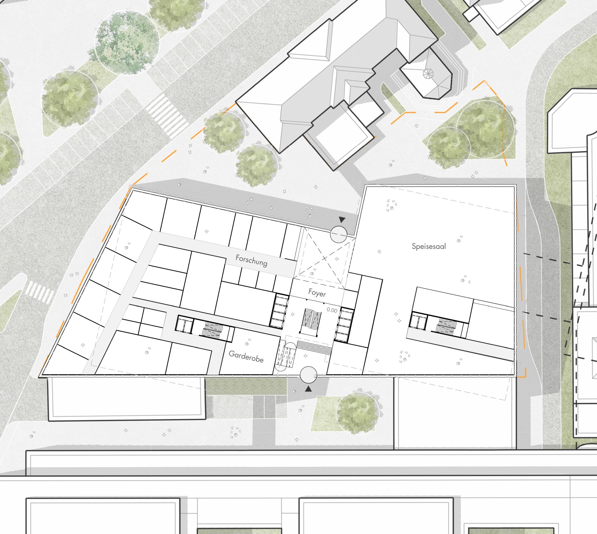 The project envisions a new hospital complex composed of several compact buildings organized on a shared podium, creating a clear and cohesive ensemble. Designed as modular and flexible structures, the buildings allow for phased construction and future adaptation. Their arrangement forms internal courtyards and green terraces, bringing in natural light, improving orientation, and strengthening the connection between interior spaces and the surrounding landscape. The urban strategy carefully integrates the complex into Innsbruck’s existing fabric. It responds to both the surrounding block structure and the openness of the mountainous landscape, establishing a defined street edge while opening toward public green spaces and pedestrian routes. This approach enhances accessibility and permeability across the site. Circulation is clearly structured, with separate flows for public, clinical, and logistical uses, alongside a legible hierarchy of entrances to support efficient navigation. Architecturally, the buildings are based on a regular structural grid and a transparent façade system, balancing efficiency with a calm, unified expression. Horizontal layering, integrated greenery, and accessible roof landscapes contribute to both environmental performance and visual coherence. Overall, the design creates a cohesive urban intervention that mediates between dense city fabric and natural surroundings, while delivering a flexible, functional, and human-centered healthcare environment.