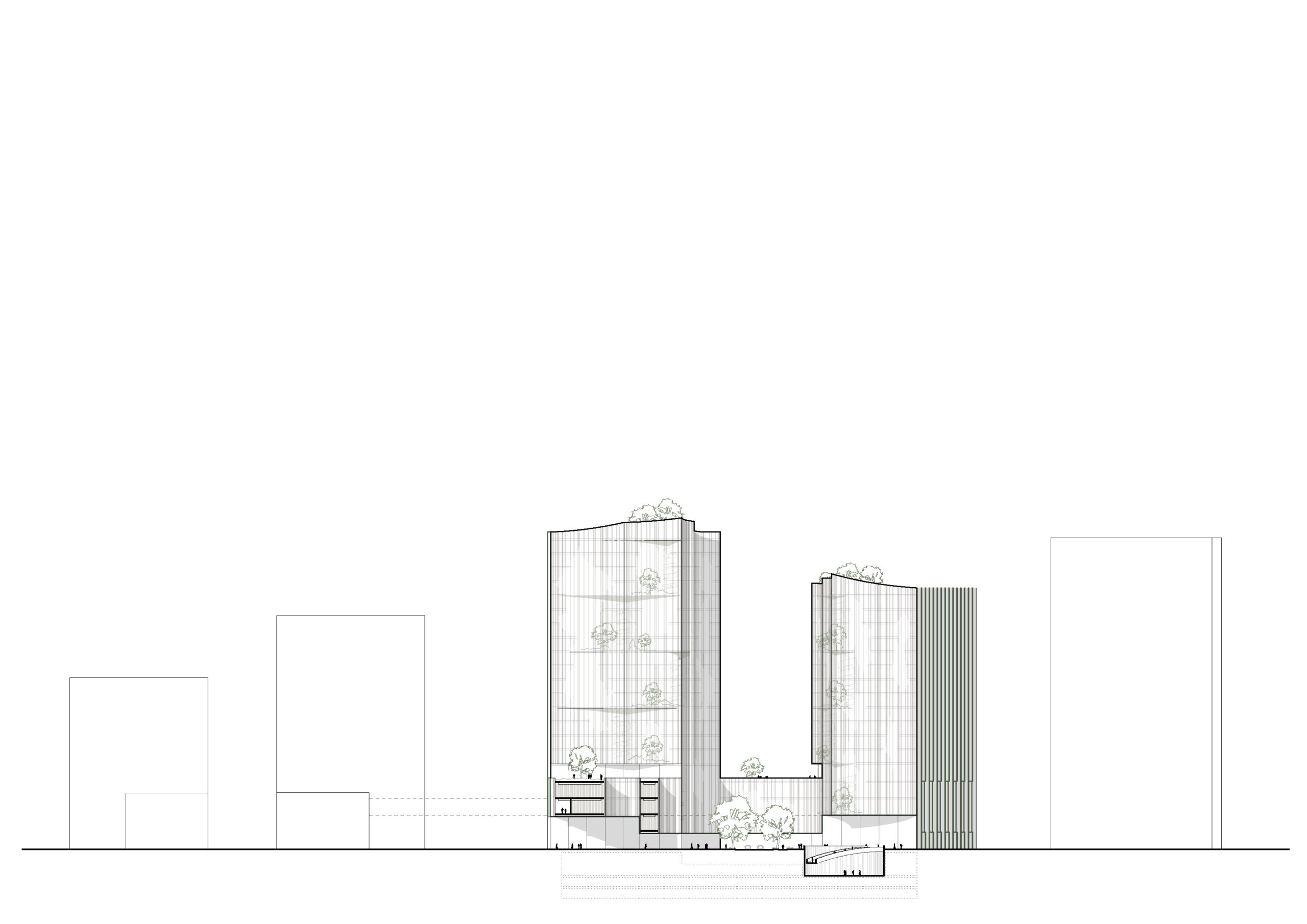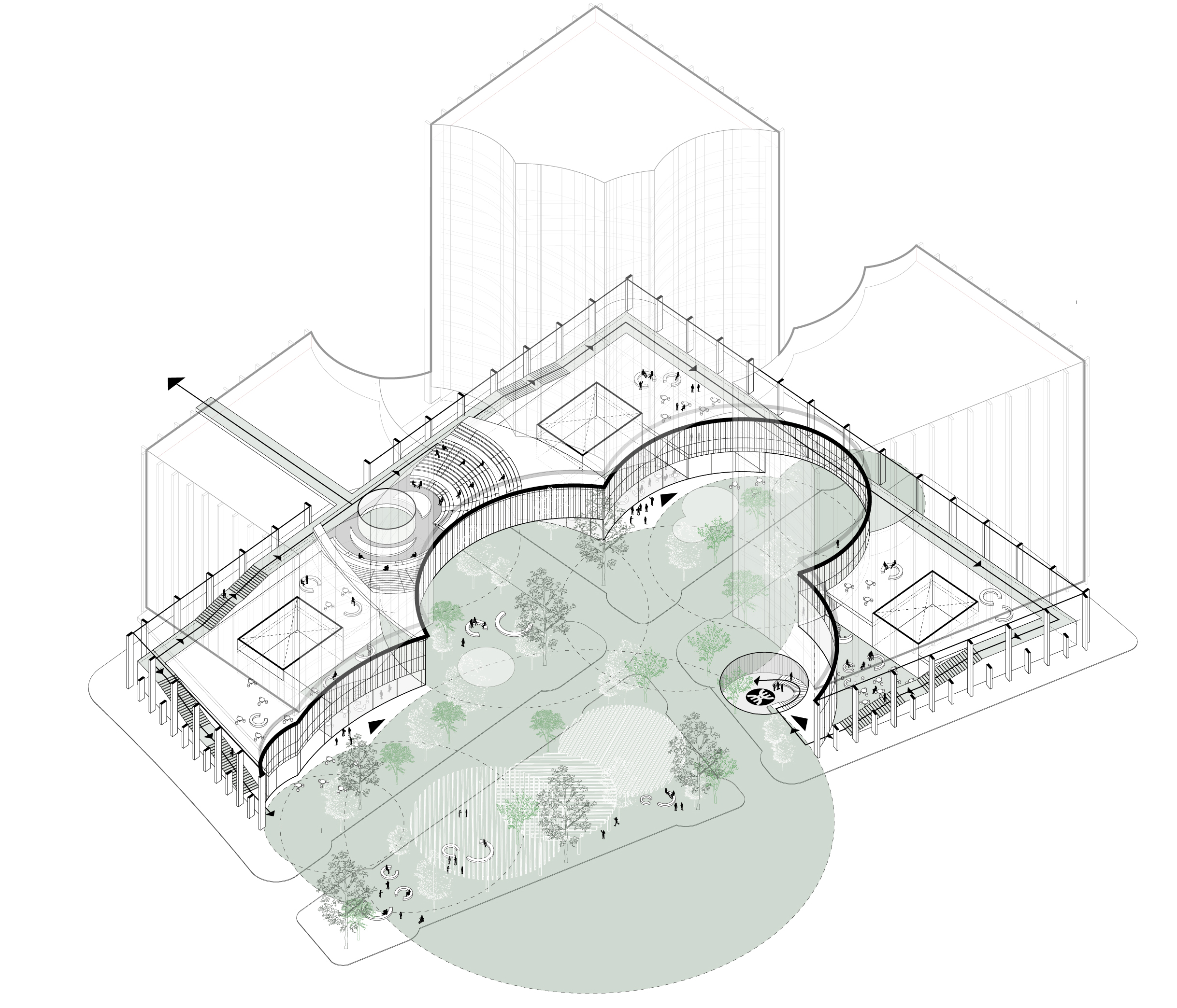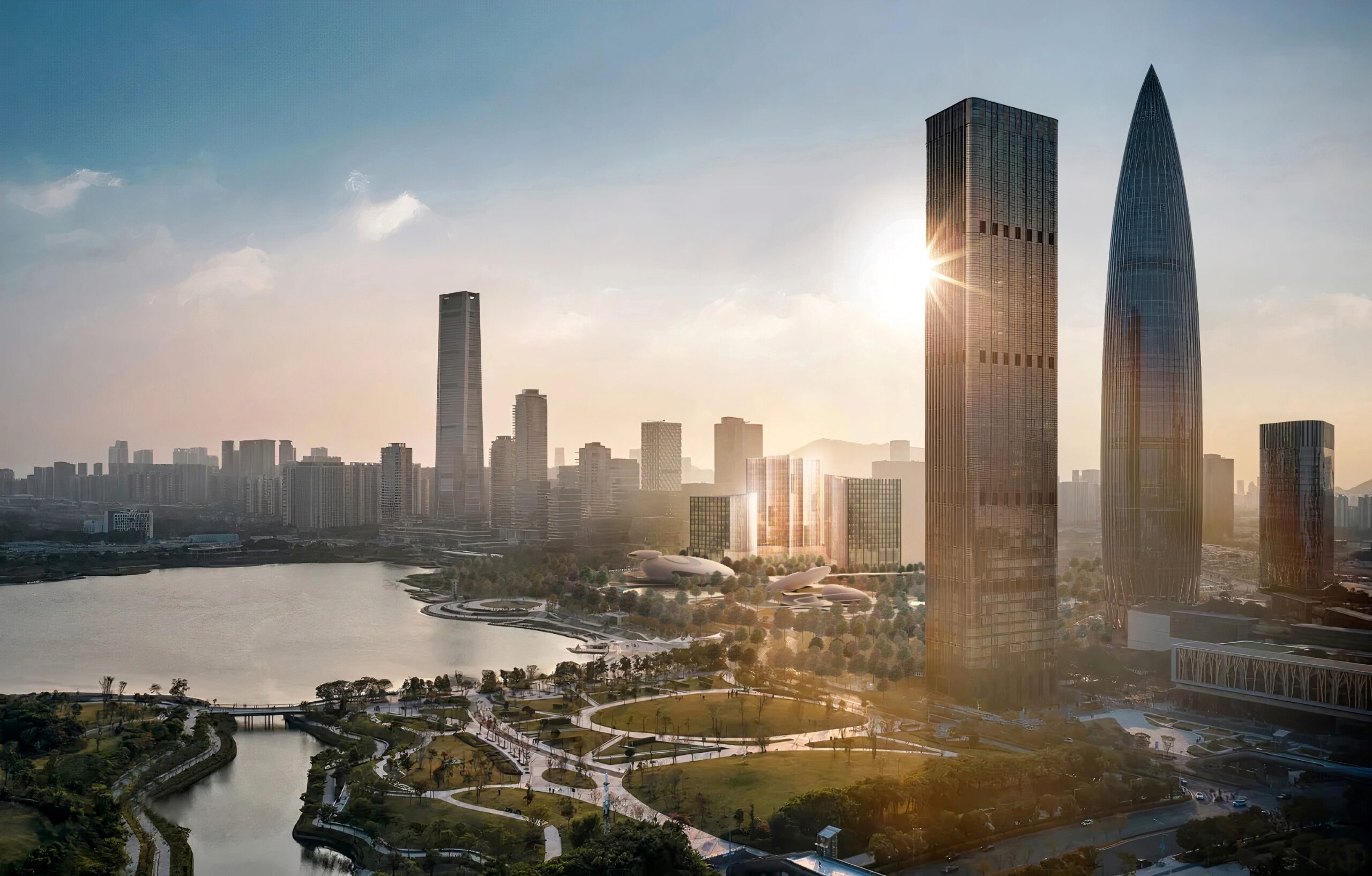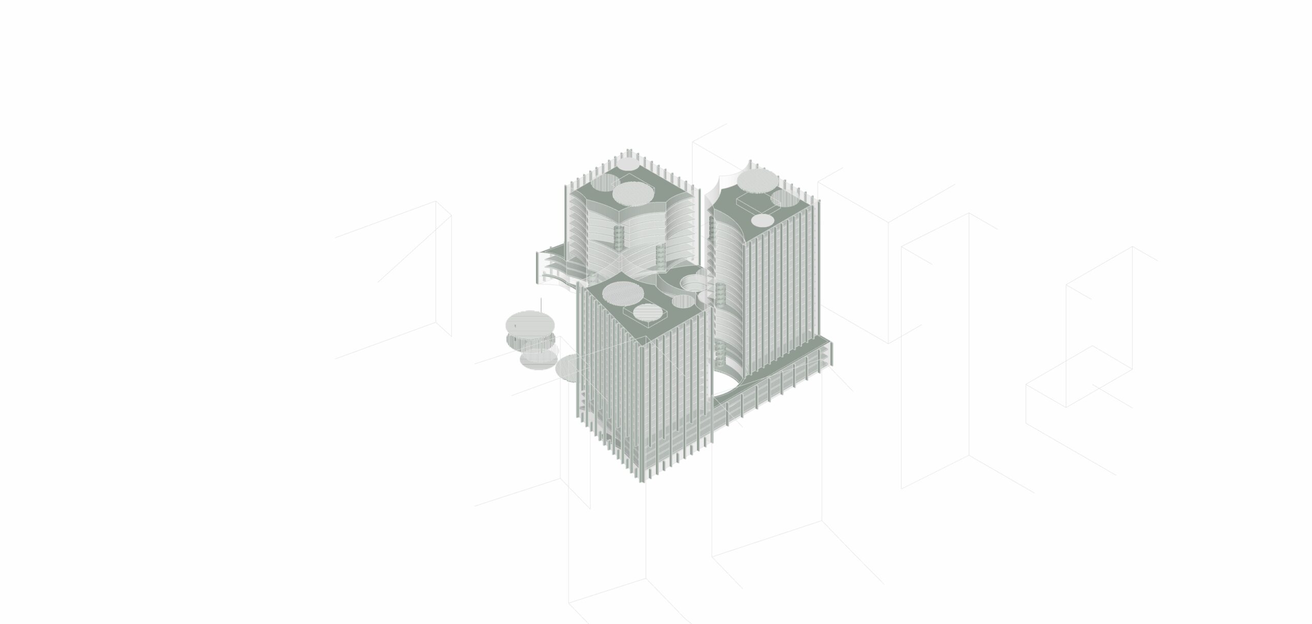 The project proposes not another tower on the waterfront of Shenzhen Bay, but a new urban plaza an open void that becomes a civic landmark between the China Huarun Building and Raffles Shenzhen Hotel. Positioned on the central axis of the bay and adjacent to the new Culture Park and metro station, the intervention establishes a gateway between nature and city, forming a transition between the tropical landscape and the dense skyline of Houhai. Rather than composing separate podium and towers, the scheme unifies the complex into a single sculpted volume generated from the extrusion of eight interlocking circles. This geometry carves a concave interior plaza, an embracing public void that becomes the symbolic heart of the project. The exterior façade aligns with the orthogonal urban grid, while the inner curvilinear façade creates a dynamic, reflective spatial experience. The result is a singular architectural figure that transforms digital symbolism into physical space, establishing a new urban identity for Shenzhen’s waterfront.