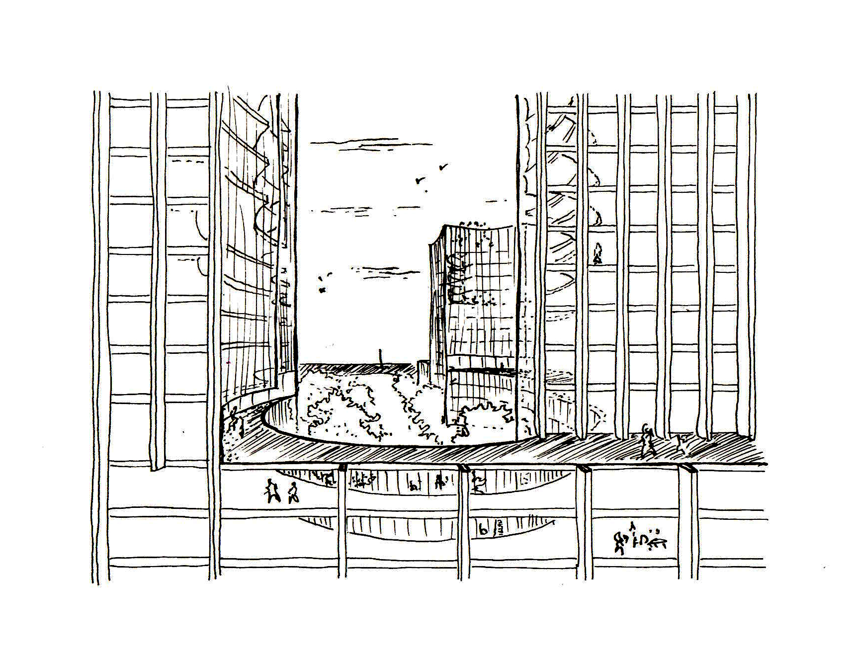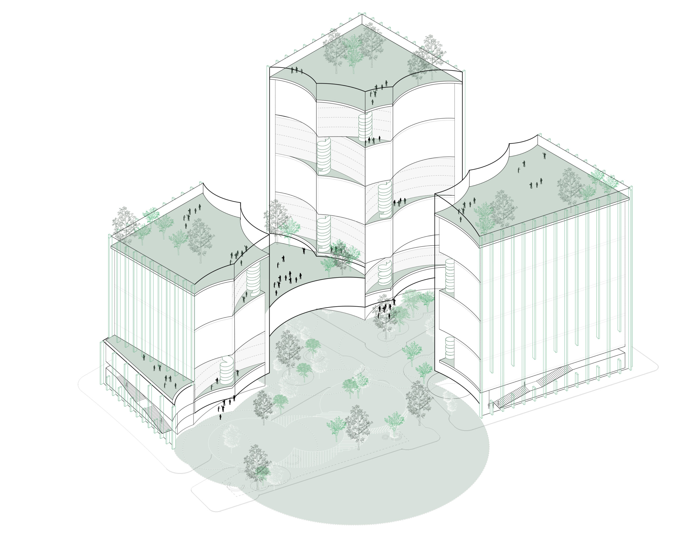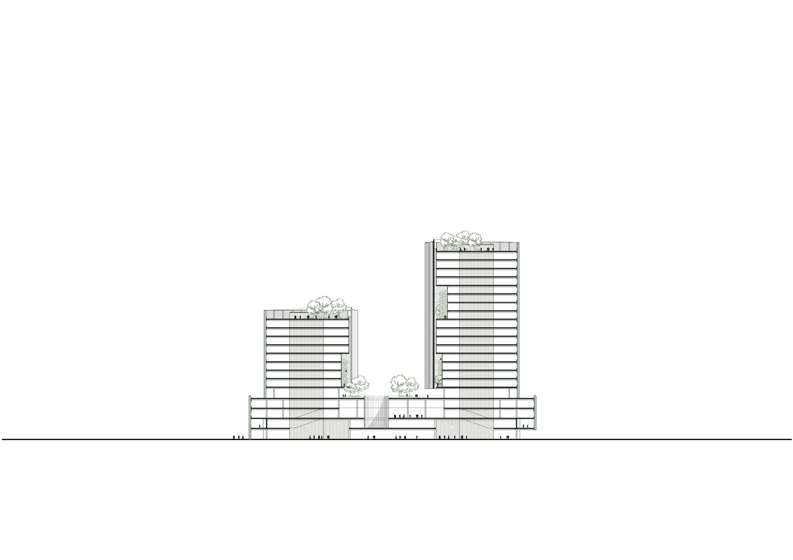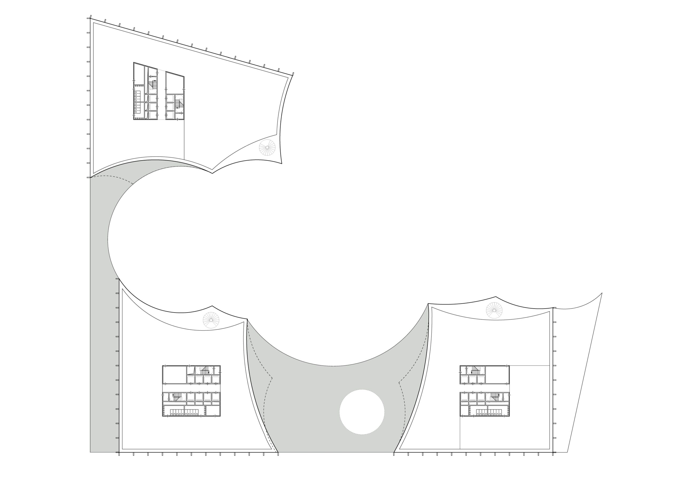 The project proposes not another tower on the waterfront of Shenzhen Bay, but a new urban plaza an open void that becomes a civic landmark between the China Huarun Building and Raffles Shenzhen Hotel. Positioned on the central axis of the bay and adjacent to the new Culture Park and metro station, the intervention establishes a gateway between nature and city, forming a transition between the tropical landscape and the dense skyline of Houhai. Rather than composing separate podium and towers, the scheme unifies the complex into a single sculpted volume generated from the extrusion of eight interlocking circles. This geometry carves a concave interior plaza, an embracing public void that becomes the symbolic heart of the project. The exterior façade aligns with the orthogonal urban grid, while the inner curvilinear façade creates a dynamic, reflective spatial experience. The result is a singular architectural figure that transforms digital symbolism into physical space, establishing a new urban identity for Shenzhen’s waterfront.